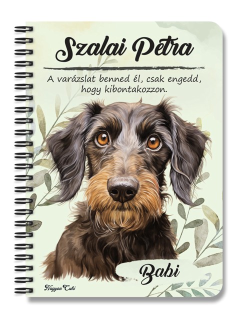 Névvel & Idézettel Kérhető - Drótszőrű tacskó portré kutyás Füzet | Egyedi Ajándék Kutyásoknak & Személyre Szabható Kutyás Ajándék | nagyoncuki.h Minden gazdi tudja, hogy a saját kutyusa a legszebb, legokosabb és legszerethetőbb a világon. Mostantól ezt a büszkeséget és szeretetet magaddal viheted mindenhová ezzel a stílusos, személyre szabható füzettel, amit kedvenc négylábúd portréja díszít. Ez a füzet nemcsak egy egyszerű jegyzetfüzet, hanem egy igazi tisztelgés a gazdi és kutyája közötti különleges kötelék előtt. A portré hűen és szeretettel ragadja meg a Drótszőrű tacskó fajta jellegzetes báját és karakterét. Tökéletes választás, ha szeretnéd a legfontosabb jegyzeteidet, terveidet vagy a kutyás kalandjaitok emlékeit egy olyan füzetbe írni, ami igazán közel áll a szívedhez. Legyen szó a kutyaovi emlékeiről, a tréning jegyzeteiről vagy a napi teendőkről, ez a kutyaportrés füzet garantáltan a kedvenced lesz.