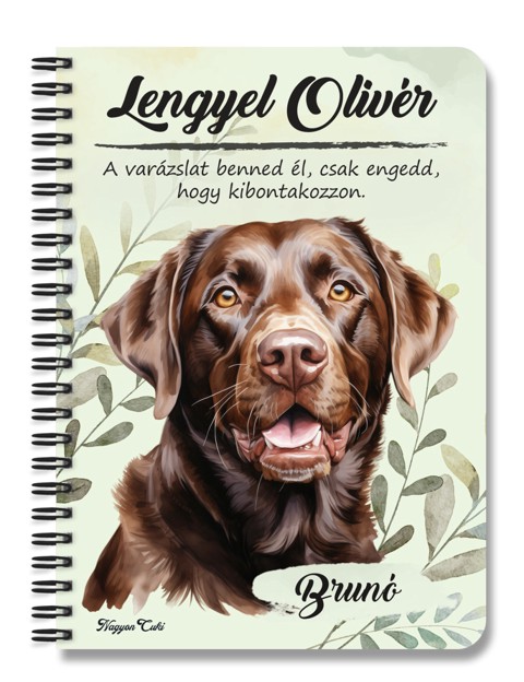 Névvel & Idézettel Kérhető - Barna labrador portré kutyás Füzet | Egyedi Ajándék Kutyásoknak & Személyre Szabható Kutyás Ajándék | nagyoncuki.h Minden gazdi tudja, hogy a saját kutyusa a legszebb, legokosabb és legszerethetőbb a világon. Mostantól ezt a büszkeséget és szeretetet magaddal viheted mindenhová ezzel a stílusos, személyre szabható füzettel, amit kedvenc négylábúd portréja díszít. Ez a füzet nemcsak egy egyszerű jegyzetfüzet, hanem egy igazi tisztelgés a gazdi és kutyája közötti különleges kötelék előtt. A portré hűen és szeretettel ragadja meg a Barna labrador fajta jellegzetes báját és karakterét. Tökéletes választás, ha szeretnéd a legfontosabb jegyzeteidet, terveidet vagy a kutyás kalandjaitok emlékeit egy olyan füzetbe írni, ami igazán közel áll a szívedhez. Legyen szó a kutyaovi emlékeiről, a tréning jegyzeteiről vagy a napi teendőkről, ez a kutyaportrés füzet garantáltan a kedvenced lesz.