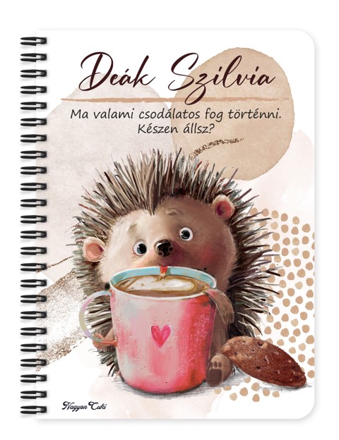 Névvel & Idézettel Kérhető Kakaós süni Mintás Füzet | Egyedi Ajándék Süni Rajongóknak & Személyre Szabható Állatos Füzet | nagyoncuki.hu Képzeld el, ahogy egy hűvös délutánon, egy meleg takaró alatt, forró teát szürcsölve a kezedben pihen ez a cuki füzet, amit a természet egyik legbájosabb teremtménye, egy aranyos süni díszít. Ez a személyre szabott füzet nemcsak egy hely a jegyzeteidnek, hanem egy szeretetteljes emlékeztető a természet csendes szépségére és a kedvesség fontosságára. Ez a kis tüskésgombóc, ahogy kíváncsian pislog a borítóról, a gyengédség, a kíváncsiság és a természetközeli nyugalom szimbóluma. Tökéletes választás, ha a legkedvesebb gondolataidat, a napi teendőidet vagy kreatív ötleteidet szeretnéd egy olyan helyen őrizni, ami melegséggel és bájjal tölti meg a szívedet. A dizájn kedves és barátságos, így kiváló ajándék ötlet a sünik rajongóinak és mindenkinek, aki értékeli a szívhez szóló, személyes meglepetéseket. Ezt a bájos füzetet mi magunk, a nagyoncuki.hu csapata terveztük, így biztos lehetsz benne, hogy egy igazán különleges, magyar dizájnnal készült darabbal leped meg szeretteidet vagy magadat! :) Miért válaszd ezt a névre szóló tündéri sünis füzetet? Teljesen Személyre Szabható: Tedd 100%-ban egyedivé! A borítóra nemcsak a nevedet kérheted, de a mintán szereplő alap idézetet is lecserélheted a saját, kedvenc motivációs üzenetedre vagy egy személyes gondolatra. Imádnivaló Süni Dizájn: A cuki süni grafika garantáltan mosolyt csal mindenki arcára, kortól függetlenül. Egy igazi cukiságbomba! Praktikus és Minőségi: A füzet két méretben (A5 és A6) elérhető. A strapabíró spirálkötés és a 60 minőségi, vonalas lap (120 oldal) gondoskodik a kényelmes használatról. Extra Meglepetés: Minden füzethez egy ajándék post-it szett is jár, hogy a legfontosabb gondolatok mindig szem előtt lehessenek. Tökéletes Ajándék Természetbarátoknak: Ideális ajándék születésnapra, névnapra, vagy csak úgy, meglepetésként valakinek, aki odavan a cuki erdei állatokért. Kinek ideális ajándék ez a cuki süni mintás füzet? A sünik rajongóinak: Mindenkinek, akinek megdobban a szíve egy aranyos süni láttán. Természetbarátoknak: Akik szeretik az erdei állatokat és a természet ihlette dizájnokat. Kreatív lelkeknek: Naplóíráshoz, rajzoláshoz, ötleteléshez. Gyerekeknek és felnőtteknek egyaránt: Hiszen a sünik kedvességét nem lehet kinőni. Bárkinek, aki egy cseppnyi kedvességre vágyik: Ez a füzet garantáltan feldobja a borúsabb napokat is. Termékjellemzők: Méretek: Választható A5 (kb. 13,5 cm x 21 cm) vagy A6 (kb. 10,5 cm x 14,5 cm) Borító: Személyre szabható névvel és/vagy egyedi idézettel, matt felülettel Belső: Kb. 60 csíkos lap (120 oldal), tetején "memo" és "Subject" segédlettel Kötés: Praktikus és tartós fekete fémspirál Extra: Ajándék post-it szett a füzet elején Egyedi felirattal is kérhető: Ne felejtsd el megadni a kért nevet és/vagy az egyedi idézetet a megjegyzés rovatban rendeléskor! Rendeld meg most ezt a teljesen személyre szabható, egyedi sünis füzetet, és vigyél egy kis erdei kedvességet a mindennapokba! Ha elvarázsolt a Cukiságok kollekció, és tetszenek a személyre szabható ajándék ötleteink, nézd meg a többi cuki állatos termékünket is a nagyoncuki.hu-n! Fedezz fel még több egyedi ajándékot állatbarátoknak és más, lélekemelő témájú csodát!