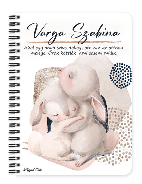 Névvel & Idézettel Kérhető cuki anya-gyerek nyuszi mintás Füzet | A legjobb ajándék Anyáknak | nagyoncuki.hu Képzeld el azt a könnyes-boldog mosolyt Édesanyád arcán, amikor átadod neki ezt a füzetet, aminek a borítóján egy anya nyuszi és a kicsinye gyengéd ölelése szimbolizálja azt a feltétel nélküli szeretetet és biztonságot, amit csak egy anya adhat. Ez a személyre szabott füzet nemcsak egy egyszerű jegyzetfüzet, hanem az anya és gyermeke közötti megbonthatatlan kötelék megható emlékkönyve. Ez a füzet az anyai szeretet, a gondoskodás és a legféltettebb, meghitt pillanatok ünneplése. Tökéletes hely, hogy leírd a legkedvesebb közös emlékeidet Édesanyáddal, összegyűjts tőle kapott családi recepteket, vagy hogy egy újdonsült anyuka jegyezze fel benne a kisbabája első éveinek megismételhetetlen csodáit. A dizájn finom, szeretetteljes és tiszta, így kiváló ajándék ötlet, amivel szavak nélkül is elmondhatod: "Köszönök mindent, Anya!". A "Cukiságok" kollekció ezen darabját is mi magunk, a nagyoncuki.hu csapata terveztük, így biztos lehetsz benne, hogy egy igazán egyedi, magyar dizájnnal készült ajándékkal leped meg magadat vagy szeretteidet! :) Miért válaszd ezt az cuki anya nyuszis füzetet? Teljesen Személyre Szabható: Tedd igazán a tiétekké! A borítóra nemcsak a neveiteket kérheted, de egy rövid, szívhez szóló üzenetet vagy egy fontos dátumot is elhelyezhetsz rajta, ami még személyesebbé teszi az ajándékot. Szívmelengető Dizájn: Az ölelkező nyuszik az anyai szeretet, a biztonság és a gyengédség legtisztább kifejezései. Praktikus és Minőségi: A füzet két méretben (A5 és A6) elérhető. A strapabíró spirálkötés és a 60 minőségi, vonalas lap (120 oldal) gondoskodik a kényelmes használatról. Extra Meglepetés: Minden füzethez egy ajándék post-it szett is jár, hogy a legfontosabb gondolatok mindig szem előtt lehessenek. Tökéletes Ajándék Anyukáknak: Ideális ajándék Anyák napjára, születésnapra, karácsonyra, vagy bármilyen alkalomra, amikor szeretnéd meglepni az Édesanyádat egy igazán megható ajándékkal. Kinek ideális ajándék ez az ölelkezős nyuszi mintás füzet? Édesanyáknak: Hogy kifejezd háládat és szeretetedet. Nagymamáknak: Hiszen az ő szeretetük is pótolhatatlan. Kismamáknak, újdonsült anyukáknak: Hogy feljegyezhessék a baba első éveinek legszebb pillanatait. Anya-lánya vagy anya-fia párosoknak: Egy közös emlékkönyvnek, amit együtt tölthetnek meg tartalommal. Termékjellemzők: Méretek: Választható A5 (kb. 13,5 cm x 21 cm) vagy A6 (kb. 10,5 cm x 14,5 cm) Borító: Személyre szabható nevekkel és/vagy egyedi idézettel, matt felülettel Belső: Kb. 60 csíkos lap (120 oldal), tetején "memo" és "Subject" segédlettel Kötés: Praktikus és tartós fekete fémspirál Extra: Ajándék post-it szett a füzet elején Egyedi felirattal is kérhető: Ne felejtsd el megadni a kért neveket és/vagy az egyedi idézetet. Rendeld meg most ezt a megható, személyre szabható füzetet, és ajándékozz egy örök emléket, ami az anyai szeretetről mesél.