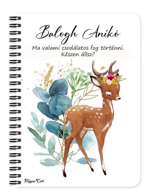 Névvel & Idézettel Kérhető Tündéri Őzike mintás Füzet | Egyedi Ajándék Nőknek | nagyoncuki.hu Képzeld el, ahogy egy csendes pillanatban kinyitod ezt a füzetet, és a borítójáról az erdő legbájosabb lakója, egy szelíd őzike néz vissza rád. Ő a természet csendes csodáinak, a harmatos reggeleknek és a békés nyugalomnak a hírnöke. Ez a személyre szabott füzet egy darabka varázslatos erdő, amit mindig magaddal vihetsz. Ez a kecses őzike az ártatlanság, a szelídség és a természettel való harmonikus kapcsolat szimbóluma. Arra inspirál, hogy a legtisztább gondolataidat, a legkedvesebb emlékeidet vagy a kreatív ötleteidet egy olyan helyen őrizd, ami békét és szépséget áraszt. Tökéletes választás naplóíráshoz, versekhez vagy a gondolatok rendezésére egy olyan füzetben, ami finom eleganciájával is kiemelkedik! :) A "Cukiságok" kollekció ezen darabját is mi magunk, a nagyoncuki.hu csapata terveztük, így biztos lehetsz benne, hogy egy igazán egyedi, magyar dizájnnal készült ajándékkal leped meg magadat vagy egy másik természetbarátot! Miért válaszd ezt a személyre szabható a tündéri őzikés mintás füzetet? Teljesen Személyre Szabható: Tedd 100%-ban egyedivé! A borítóra nemcsak a nevedet kérheted, de a mintán szereplő alap idézetet is lecserélheted a saját, kedvenc motivációs üzenetedre vagy egy személyes gondolatra. Nyugtató és Időtlen Dizájn: Az őzike finom vonalai és szelíd tekintete egy olyan elegáns mintát alkotnak, ami sosem megy ki a divatból. Praktikus és Minőségi: A füzet két méretben (A5 és A6) elérhető. A strapabíró spirálkötés és a 60 minőségi, vonalas lap (120 oldal) gondoskodik a kényelmes használatról. Extra Meglepetés: Minden füzethez egy ajándék post-it szett is jár, hogy a legfontosabb gondolatok mindig szem előtt lehessenek. Tökéletes Ajándék a Természet Szerelmeseinek: Ideális ajándék születésnapra, névnapra, vagy csak úgy, hogy egy kis természetközeli szépséget ajándékozz! Kinek ideális ajándék ez a szépséges őz mintás füzet? Mindenkinek, akit elvarázsol az őzikék bája és az erdei állatok világa. Természetbarátoknak, túrázóknak, erdőjáróknak, akik szívükben hordozzák az erdő szeretetét. A kecses, elegáns és letisztult dizájnok kedvelőinek. Lányoknak, nőknek, akik szeretik a szelíd, nőies, de nem hivalkodó mintákat. Bárkinek, aki értékeli a cuki állatokat és egy különleges ajándékot keres. Termékjellemzők: Méretek: Választható A5 (kb. 13,5 cm x 21 cm) vagy A6 (kb. 10,5 cm x 14,5 cm) Borító: Személyre szabható névvel és/vagy egyedi idézettel, matt felülettel Belső: Kb. 60 csíkos lap (120 oldal), tetején "memo" és "Subject" segédlettel Kötés: Praktikus és tartós fekete fémspirál Extra: Ajándék post-it szett a füzet elején Egyedi felirattal is kérhető: Ne felejtsd el megadni a kért nevet és/vagy az egyedi idézetet a megjegyzés rovatban rendeléskor! Rendeld meg most ezt a teljesen személyre szabható, egyedi őzikés füzetet, és vigyél egy kis erdei nyugalmat a mindennapokba...mert mindenkinek jár egy kis cukiság. Ha elvarázsolt ez a tündéri dizájn, és tetszenek a személyre szabható ajándék ötleteink, nézd meg a többi aranyos figurát is a Cukiságok kollekció a nagyoncuki.hu-n! Fedezz fel még több egyedi ajándékot állatbarátoknak és más, vidám témájú csodát!