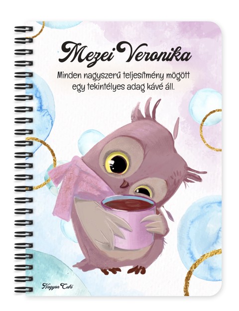 Névvel & Idézettel Kérhető Cuki kávés bagoly Mintás Füzet | Egyedi Ajándék Bagoly Rajongóknak és a Tudás szerelmeseinek | nagyoncuki.hu Képzeld el, ahogy az esti csendben, egy lámpa fényénél leülsz, hogy papírra vesd a gondolataidat, és a füzet borítójáról egy bölcs kis bagoly figyel rád. Ő a tudás, az elmélyült gondolatok és a titkok tudójának szimbóluma, a tökéletes társ a nagy ötletek megszületéséhez. Ez a cuki bagoly a bölcsesség és a tanulás iránti szeretetet testesíti meg. Arra inspirál, hogy a legfontosabb jegyzeteidet, a legkreatívabb ötleteidet vagy a legmélyebb érzéseidet egy olyan helyen őrizd, ami segít a fókuszálásban és a gondolatok rendszerezésében. Tökéletes társ a vizsgákra való készüléshez, egy új dolog elsajátításához vagy egyszerűen csak egy jó könyv melletti jegyzeteléshez. A "Cukiságok" kollekció ezen darabját is mi magunk, a nagyoncuki.hu csapata terveztük, így biztos lehetsz benne, hogy egy igazán egyedi, magyar dizájnnal készült ajándékkal leped meg magadat, egy bagoly rajongót vagy egy másik tudásra szomjazó lelket! :) Miért válaszd ezt a személyre szabható cuki bagoly mintás füzetet? Teljesen Személyre Szabható: Tedd 100%-ban egyedivé! A borítóra nemcsak a nevedet kérheted, de a mintán szereplő alap idézetet is lecserélheted a saját, inspiráló mottódra vagy egy kedvenc idézetedre. Bölcs és Bájos Dizájn: A bagoly figura egyszerre sugározza a tudást és az ellenállhatatlan cukiságot, ami minden korosztály számára vonzóvá teszi. Praktikus és Minőségi: A füzet két méretben (A5 és A6) elérhető. A strapabíró spirálkötés és a 60 minőségi, vonalas lap (120 oldal) gondoskodik a kényelmes használatról. Extra Meglepetés: Minden füzethez egy ajándék post-it szett is jár, hogy a legfontosabb gondolatok mindig szem előtt lehessenek. Tökéletes Ajándék a Tanuláshoz:Ideális ajándék tanévkezdésre, vizsgaidőszakra, ballagásra, vagy tanároknak, hogy megköszönd a munkájukat! Kinek ideális ajándék ez a cuki baglyos füzet? Minden bagolyrajongónak, aki imádja ezeket a titokzatos madarakat. Diákoknak, hallgatóknak, tanároknak, akiknek a tudás a szenvedélyük. Könyvmolyoknak és íróknak, akik számára a jegyzetelés a mindennapok része. Éjszakai baglyoknak", akik este a legkreatívabbak és legproduktívabbak. Bárkinek, aki szereti a bölcsességet sugárzó, mégis cuki ajándékokat. Termékjellemzők: Méretek: Választható A5 (kb. 13,5 cm x 21 cm) vagy A6 (kb. 10,5 cm x 14,5 cm) Borító: Személyre szabható névvel és/vagy egyedi idézettel, matt felülettel Belső: Kb. 60 csíkos lap (120 oldal), tetején "memo" és "Subject" segédlettel Kötés: Praktikus és tartós fekete fémspirál Extra: Ajándék post-it szett a füzet elején Egyedi felirattal is kérhető: Ne felejtsd el megadni a kért nevet és/vagy az egyedi idézetet a megjegyzés rovatban rendeléskor! Rendeld meg most ezt a teljesen személyre szabható, egyedi baglyos füzetet, és engedd szárnyalni a gondolataidat...mert mindenkinek jár egy kis cukiság. Ha elvarázsolt ez a tündéri dizájn, és tetszenek a személyre szabható ajándék ötleteink, nézd meg a többi aranyos figurát is a Cukiságok kollekció a nagyoncuki.hu-n! Fedezz fel még több egyedi ajándékot és más, vidám témájú csodát!