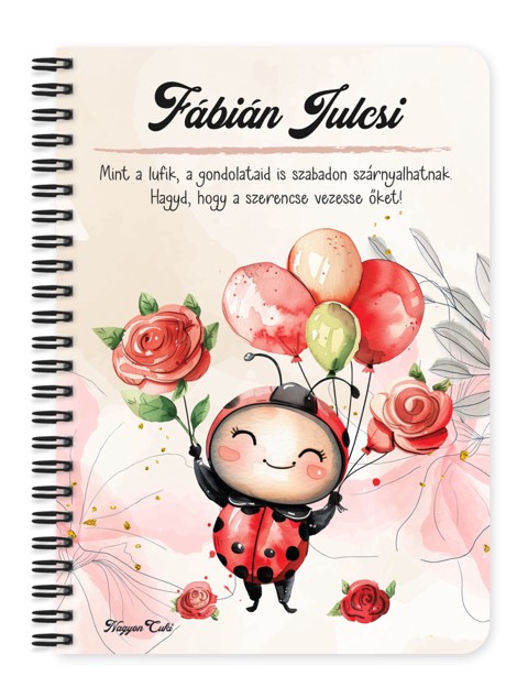 Névvel & Idézettel Kérhető Cuki lufis katica Mintás Füzet | Egyedi Ajándék Katica Rajongóknak | nagyoncuki.hu Képzeld el, hogy minden napot egy apró szerencsehozóval indítasz! Ez a füzet, aminek borítójáról egy kedves katica mosolyog rád, pontosan ezt az érzést hozza el. Ő egy vidám emlékeztető: a szerencse gyakran a legapróbb, legváratlanabb dolgokban rejlik, és a pozitivitás vonzza a jót. A katica ősidők óta a szerencse, a boldogság és a védelem szimbóluma. Ez a pöttyös kis barát arra inspirál, hogy mindig optimistán tekints a jövőbe, és vedd észre a szépséget a körülötted lévő világban. Tökéletes társ a legpozitívabb gondolatok, a nagy tervek és a szerencsés pillanatok feljegyzésére egy olyan füzetben, ami csupa jókedvet áraszt. A "Cukiságok" kollekció ezen darabját is mi magunk, a nagyoncuki.hu csapata terveztük, így biztos lehetsz benne, hogy egy igazán egyedi, hazai dizájnnal készült ajándékkal leped meg magadat vagy szeretteidet! :) Miért válaszd ezt a személyre szabható bájos katicás füzetet? Teljesen Személyre Szabható: Tedd 100%-ban egyedivé! A borítóra nemcsak a nevedet kérheted, de a mintán szereplő alap idézetet is lecserélheted a saját, kedvenc motivációs üzenetedre vagy egy személyes gondolatra. Szerencsehozó Dizájn: A katica egyetemes pozitív jelentése miatt ez a füzet több mint egy szép tárgy – egy igazi kabala lehet a mindennapokban. Praktikus és Minőségi: A füzet két méretben (A5 és A6) elérhető. A strapabíró spirálkötés és a 60 minőségi, vonalas lap (120 oldal) gondoskodik a kényelmes használatról. Extra Meglepetés: Minden füzethez egy ajándék post-it szett is jár, hogy a legfontosabb gondolatok mindig szem előtt lehessenek. Tökéletes Ajándék a Szerencséért: Ideális ajándék vizsga, állásinterjú, új munkahely vagy bármilyen nagy esemény előtt, hogy egy kis extra támogatást nyújts! Kinek ideális ajándék ez a cuki katica mintás füzet? A katicabogarak rajongóinak: Akik imádják ezeket a vidám, pöttyös rovarokat. Akiknek egy kis extra szerencsére van szükségük: Legyen szó diákról, pályakezdőről vagy bárkiről, aki új kihívás előtt áll. Barátoknak, kollégáknak: Akiknek a személyiségéhez passzol egy ilyen vidám, kedves ajándék. Bárkinek, akinek egy vidám, optimista ajándékot szeretnél adni, ami garantáltan mosolyt csal az arcára. Termékjellemzők: Méretek: Választható A5 (kb. 13,5 cm x 21 cm) vagy A6 (kb. 10,5 cm x 14,5 cm) Borító: Személyre szabható névvel és/vagy egyedi idézettel, matt felülettel Belső: Kb. 60 csíkos lap (120 oldal), tetején "memo" és "Subject" segédlettel Kötés: Praktikus és tartós fekete fémspirál Extra: Ajándék post-it szett a füzet elején Egyedi felirattal is kérhető: Ne felejtsd el megadni a kért nevet és/vagy az egyedi idézetet a megjegyzés rovatban rendeléskor! Ha elvarázsolt ez a huncut dizájn, és tetszenek a személyre szabható ajándék ötleteink, nézd meg a többi aranyos figurát is a Cukiságok kollekció a nagyoncuki.hu-n! Fedezz fel még több egyedi ajándékot állatbarátoknak és más, vidám témájú csodát!