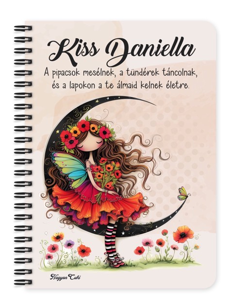 Névvel & Idézettel Kérhető Kedves pipacs tündérlány és a hold Mintás Füzet | A legjobb Ajándék Álmodozóknak | nagyoncuki.hu Képzeld el, ahogy egy csendes estén a holdfény beszűrődik az ablakon, te pedig kinyitod ezt a varázslatos füzetet, hogy leírd a legféltettebb álmaidat és gondolataidat. A borítóján egy tündérlány üldögél a hold sarlóján, pipacsokat tartva a kezében, szimbolizálva az álmok, a belső béke és a fantázia végtelen világát. Ez a tündéres füzet 'a furik' kollekció része, ahol a tökéletlenség a legfőbb báj, és a különcség tesz minket igazán szerethetővé. A pipacsos tündér nem egy harsány hercegnő, hanem egy csendes, álmodozó lélek, aki a saját holdján ülve szemléli a világot. Ő a te belső, kreatív éned tükörképe, aki arra bátorít, hogy merj a fantáziádra hallgatni és a saját utadat járni. AEzt a bájosan zilált tündért mi magunk, a nagyoncuki.hu csapata terveztük, így biztos lehetsz benne, hogy egy igazán egyedi és különleges, művészi darabbal leped meg magadat vagy egy hozzád hasonló álmodozó lelket! :) Miért válaszd ezt a bájos tündéres füzetet? Teljesen Személyre Szabható: Tedd igazán a tiéddé! A borítóra nemcsak a nevedet kérheted, de egy saját, lélekemelő idézetet, verssort vagy egy fontos gondolatot is elhelyezhetsz rajta. Egyedi, Művészi Dizájn: Ez nem egy tömegtermék. A "furi" stílusú grafika azoknak szól, akik értékelik az eredetiséget és a nem mindennapi szépséget. Praktikus és Minőségi: A füzet két méretben (A5 és A6) elérhető. A strapabíró spirálkötés és a 60 minőségi, vonalas lap (120 oldal) gondoskodik a kényelmes használatról. Extra Meglepetés: Minden füzethez egy ajándék post-it szett is jár, hogy a legfontosabb gondolatok mindig szem előtt lehessenek. Tökéletes Ajándék Álmodozóknak: Ideális ajándék születésnapra, névnapra, vagy csak úgy, meglepetésként egy kreatív, érzékeny léleknek. Kinek ideális ajándék ez a szépséges tündér mintás füzet? Álmodozó lelkeknek: Akik szeretnek elmerülni a gondolataikban és a fantázia világában. Naplóíróknak: Akik egy inspiráló és mesés hangulatú füzetbe szeretnék írni a gondolataikat. A tündérek és a mesék rajongóinak: Akik hisznek a varázslatban. Azoknak, akik szeretik a 'furi' stílust: Ha valami igazán egyedit keresel, ami kilóg a sorból, de a legcukibb módon. Nőknek, lányoknak, akik értékelik a finom, nőies és jelentéssel bíró ajándékokat. Termékjellemzők: Méretek: Választható A5 (kb. 13,5 cm x 21 cm) vagy A6 (kb. 10,5 cm x 14,5 cm) Borító: Személyre szabható nevekkel és/vagy egyedi idézettel, matt felülettel Belső: Kb. 60 csíkos lap (120 oldal), tetején "memo" és "Subject" segédlettel Kötés: Praktikus és tartós fekete fémspirál Extra: Ajándék post-it szett a füzet elején Egyedi felirattal is kérhető: Ne felejtsd el megadni a kért neveket és/vagy az egyedi idézetet. RRendeld meg most ezt a teljesen személyre szabható, varázslatos füzetet, és őrizd meg benne a legfényesebb álmaidat!