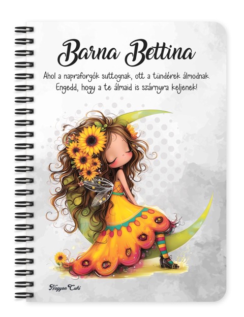 Névvel Kérhető - Lazulós Napraforgós tündérlány és a Hold Füzet | Egyedi Ajándék Nőknek & Személyes Tündéres Napló | nagyoncuki.hu Képzeld el azt a varázslatos mosolyt a megajándékozott arcán, amikor egy olyan füzetet tart a kezében, amely nemcsak a gondolatait, álmait vagy fontos jegyzeteit őrzi, hanem a fantázia, a furik báj és a napsugaras pillanatok iránti szeretetét is tükrözi! Ez a különleges, névre szóló, egyedi tervezésű napraforgós tündérlányos füzet a könnyed elegancia, a játékos furcsaság és a napfényes álmok bájos megtestesítője. Egy apró, szeretetteljes gesztus, amely a mindennapokat is fénnyel tölti meg, és inspirációt ad minden lapon. Kiváló ajándék ötlet nőknek és mindenkinek, aki értékeli a személyes és lélekemelő meglepetéseket. Ez a tündéres füzet a mesebeli békét, a képzelet szabadságát és a nyári örömök megélésének örömét ötvözi egy aranyos, félholdon üldögélő, napraforgós tündérlány figurájában. Ahogy a furik tündérlány elmerül a békés szemlélődésben, nyugalmat és pozitív energiákat sugároz. Akár naplóként, jegyzetfüzetként, receptkönyvként vagy ötletfüzetként használod, ez a tündéres mintás füzet tökéletes társ lesz minden pillanatban. A dizájn kedves és egyedi, tökéletes ajándék ötlet azoknak, akik szeretik a különleges és szívhez szóló meglepetéseket, és imádják a személyes ajándékokat :) Ezt a bájos füzetet mi magunk, a nagyoncuki.hu csapata terveztük, így biztos lehetsz benne, hogy egy igazi, nagy áruházakban nem kapható különlegességgel leped meg szeretteidet vagy magadat! :) Miért válaszd ezt a bájos tündéres füzetet? Teljesen Személyre Szabható: Tedd igazán a tiéddé! A borítóra nemcsak a nevedet kérheted, de egy saját, lélekemelő idézetet, verssort vagy egy fontos gondolatot is elhelyezhetsz rajta. Egyedi, Művészi Dizájn: Ez nem egy tömegtermék. A "furi" stílusú grafika azoknak szól, akik értékelik az eredetiséget és a nem mindennapi szépséget. Praktikus és Minőségi: A füzet két méretben (A5 és A6) elérhető. A strapabíró spirálkötés és a 60 minőségi, vonalas lap (120 oldal) gondoskodik a kényelmes használatról. Extra Meglepetés: Minden füzethez egy ajándék post-it szett is jár, hogy a legfontosabb gondolatok mindig szem előtt lehessenek. Tökéletes Ajándék Álmodozóknak: Ideális ajándék születésnapra, névnapra, vagy csak úgy, meglepetésként egy kreatív, érzékeny léleknek. Kinek ideális ajándék ez a szépséges tündér mintás füzet? Álmodozó lelkeknek: Akik szeretnek elmerülni a gondolataikban és a fantázia világában. Naplóíróknak: Akik egy inspiráló és mesés hangulatú füzetbe szeretnék írni a gondolataikat. A tündérek és a mesék rajongóinak: Akik hisznek a varázslatban. Azoknak, akik szeretik a 'furi' stílust: Ha valami igazán egyedit keresel, ami kilóg a sorból, de a legcukibb módon. Nőknek, lányoknak, akik értékelik a finom, nőies és jelentéssel bíró ajándékokat. Hol használhatod a Napraforgós Tündérlány és a Hold füzetet? Otthon: Naplózáshoz, receptek leírásához, ötleteléshez, vagy akár csak bevásárlólistákhoz. Irodában/Suliban: Jegyzeteléshez, határidők rögzítéséhez, vagy inspiráló segítőként a kreatív munkához. Ajándékként: Önmagában is egy csodás meglepetés, de akár egy tündér témájú ajándékcsomag részeként is tökéletes választás. Termékjellemzők: Méretek: Választható A5 (kb. 13,5 cm x 21 cm) vagy A6 (kb. 10,5 cm x 14,5 cm) Borító: Személyre szabható nevekkel és/vagy egyedi idézettel, matt felülettel Belső: Kb. 60 csíkos lap (120 oldal), tetején "memo" és "Subject" segédlettel Kötés: Praktikus és tartós fekete fémspirál Extra: Ajándék post-it szett a füzet elején Egyedi felirattal is kérhető: Ne felejtsd el megadni a kért neveket és/vagy az egyedi idézetet. Rendeld meg most ezt az egyedi, névre szóló tündéres füzetet, és vigyél egy kis extra napsugaras inspirációt a mindennapokba!