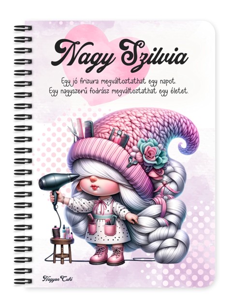 Névvel & Idézettel Kérhető Fodrász manólány hajszárítóval mintás Füzet | Egyedi Ajándék Fodrásznak | nagyoncuki.hu Képzeld el, ahogy átadod ezt a cuki füzetet a kedvenc fodrászodnak, akinek a kezei között mindig újjászületsz! Ez a személyre szabott füzet több mint egy jegyzetfüzet: egy kedves "köszönöm" a kreativitásáért, a türelméért és a sok jó beszélgetésért, amit a székében ülve megosztotok egymással. Ez a kis ollóval és fésűvel felszerelkezett manólány a stílus, a szépség és az alkotás iránti szenvedély szimbóluma. Tökéletes választás egy fodrász számára, hogy feljegyezze benne a vendégei időpontjait, inspirációkat gyűjtsön új frizurákhoz, vagy vezesse a saját üzleti teendőit. A dizájn vidám és elismerő, így kiváló ajándék ötlet, amivel kifejezheted a háládat. A "Cuki manók" kollekció ezen darabját is mi magunk, a nagyoncuki.hu csapata terveztük, így biztos lehetsz benne, hogy egy igazán egyedi, magyar dizájnnal készült ajándékkal leped meg a kedvenc szakemberedet. :)