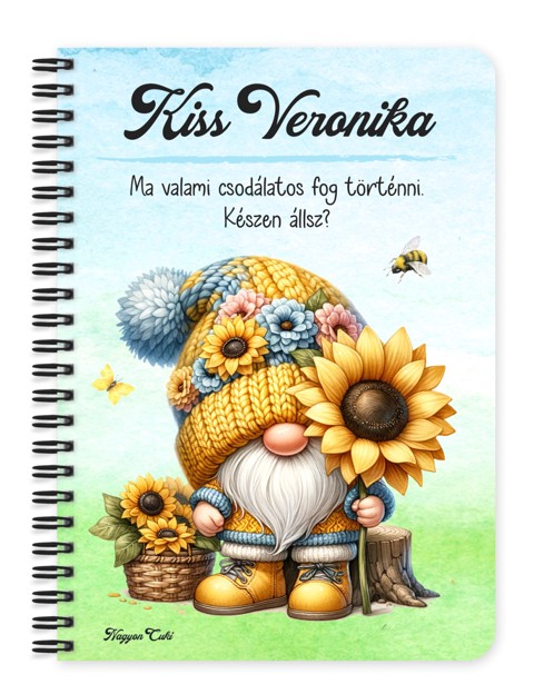 Névvel & Idézettel Kérhető Cuki napraforgós manó mintás Füzet | Legjobb ajándék Nőknek | nagyoncuki.hu Képzeld el, ahogy kinyitod ezt a füzetet, és szinte érzed a nyári nap melegét és a napraforgók illatát! A borítóján egy kedves kis manó ölel át egy hatalmas napraforgót, szimbolizálva a feltétel nélküli optimizmust, a pozitivitást és a természet éltető erejét. Ez a személyre szabott füzet egy hordozható adag napsütés a borúsabb napokra is. Ez a vidám manó a boldogság, a belső erő és a fény felé fordulás apró, de annál erősebb szimbóluma. Arra emlékeztet minket, hogy még a legnehezebb időkben is keressük a fényt és a jót az életünkben. Tökéletes választás hálanapló vezetéséhez, pozitív megerősítések leírásához, vagy a legvidámabb gondolatok és tervek összegyűjtésére. A "Cuki manók" kollekció ezen darabját is mi magunk, a nagyoncuki.hu csapata terveztük, így biztos lehetsz benne, hogy egy igazán egyedi, magyar dizájnnal készült ajándékkal leped meg magadat vagy egy számodra fontos, napsugaras lelkű személyt. :)