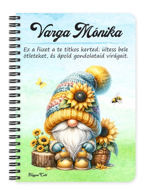Névvel & Idézettel Kérhető Ülő napraforgós manó mintás Füzet | Legjobb ajándék Nőknek | nagyoncuki.hu Képzeld el, ahogy kinyitod ezt a füzetet, és szinte érzed a nyári nap melegét és a napraforgók illatát! A borítóján egy kedves kis manó ölel át egy hatalmas napraforgót, szimbolizálva a feltétel nélküli optimizmust, a pozitivitást és a természet éltető erejét. Ez a személyre szabott füzet egy hordozható adag napsütés a borúsabb napokra is. Ez a vidám manó a boldogság, a belső erő és a fény felé fordulás apró, de annál erősebb szimbóluma. Arra emlékeztet minket, hogy még a legnehezebb időkben is keressük a fényt és a jót az életünkben. Tökéletes választás hálanapló vezetéséhez, pozitív megerősítések leírásához, vagy a legvidámabb gondolatok és tervek összegyűjtésére. A "Cuki manók" kollekció ezen darabját is mi magunk, a nagyoncuki.hu csapata terveztük, így biztos lehetsz benne, hogy egy igazán egyedi, magyar dizájnnal készült ajándékkal leped meg magadat vagy egy számodra fontos, napsugaras lelkű személyt. :)