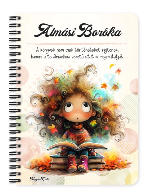 Névvel Kérhető - Álmodó őszi könyvmoly lányos Füzet | Egyedi Ajándék Nőknek & Személyes Napló | nagyoncuki.hu Képzeld el azt a mosolyt és inspirációt a megajándékozott arcán, amikor egy olyan füzetet tart a kezében, amely nemcsak a legféltettebb gondolatait, álmait vagy fontos jegyzeteit őrzi, hanem az őszi meghittség, a furik báj és az olvasás iránti szeretetét is tükrözi! Ez a különleges, személyre szabható, egyedi tervezésű őszi olvasó lányos füzet a könnyed elegancia, a játékos furcsaság és a nyugodt, elmélyült pillanatok bájos megtestesítője. Egy apró, szeretetteljes gesztus, amely a mindennapokat is fénnyel tölti meg, és minden lapon új ötletekre sarkall. Kiváló ajándék ötlet nőknek és mindenkinek, aki értékeli a személyes és lélekemelő meglepetéseket. Ez az olvasós füzet az őszi békét, a képzelet szabadságát és a könyvek világának örömét ötvözi egy aranyos, őszi mintás, bájosan zilált olvasó lány figurájában. Ahogy a furik olvasó lány elmerül a könyvében, nyugalmat és pozitív energiákat sugároz, és arra ösztönöz, hogy te is elmerülj a saját világodban. Akár naplóként, jegyzetfüzetként, receptkönyvként vagy ötletfüzetként használod, ez a furik mintás füzet tökéletes társ lesz minden kreatív és meditatív pillanatban. A dizájn kedves és egyedi, tökéletes ajándék ötlet azoknak, akik szeretik a különleges és szívhez szóló meglepetéseket, és imádják a személyes ajándékokat :)