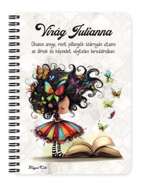 Személyre szabható - Pillangós könyv hercegnő füzet Füzet | Egyedi Ajándék Nőknek & Személyes Napló | nagyoncuki.hu Képzeld el azt a mosolyt és inspirációt a megajándékozott arcán, amikor egy olyan füzetet tart a kezében, amely nemcsak a legféltettebb gondolatait, álmait vagy fontos jegyzeteit őrzi, hanem az olvasás iránti szeretetét is tükrözi! Ez a különleges, személyre szabható, egyedi tervezésű egy apró, szeretetteljes gesztus, amely a mindennapokat is fénnyel tölti meg, és minden lapon új ötletekre sarkall. Kiváló ajándék ötlet nőknek és mindenkinek, aki értékeli a személyes és lélekemelő meglepetéseket. Akár naplóként, jegyzetfüzetként, receptkönyvként vagy ötletfüzetként használod, ez a cuki füzet tökéletes társ lesz minden kreatív és meditatív pillanatban.