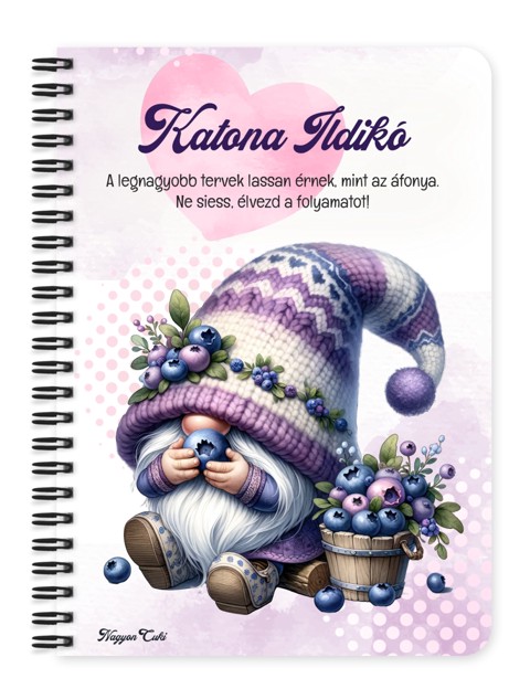 Személyre szabható - Nyami Áfonyás manó Füzet mintás Füzet | Egyedi Ajándék Nőknek & Személyes Napló | nagyoncuki.hu Képzeld el azt a mosolyt a megajándékozott arcán, amikor egy olyan füzetet tart a kezében, ami a legféltettebb gondolatait, álmait vagy fontos jegyzeteit őrzi. Ez a különleges, személyre szabható, egyedi tervezésű áfonyás manó füzet a könnyed elegancia, a játékos cukiság és a nyugodt, elmélyült pillanatok bájos megtestesítője. Egy apró, szeretetteljes gesztus, amely a mindennapokat is fénnyel tölti meg, és minden lapon új ötletekre sarkall. Kiváló ajándék ötlet nőknek és mindenkinek, aki értékeli a személyes és lélekemelő meglepetéseket. Akár naplóként, jegyzetfüzetként, receptkönyvként vagy ötletfüzetként használod, ez a manós mintás füzet tökéletes társ lesz minden kreatív és meditatív pillanatban. A dizájn kedves és egyedi, tökéletes ajándék ötlet azoknak, akik szeretik a különleges és szívhez szóló meglepetéseket, és imádják a személyes ajándékokat. A "Cuki manók" kollekció ezen darabját is mi magunk, a nagyoncuki.hu csapata terveztük, így biztos lehetsz benne, hogy egy igazán egyedi és különleges manós ajándék darabbal leped meg szeretteidet vagy magadat. :) Miért válaszd ezt a cuki áfonyás manó mintás füzetet? Teljesen Személyre Szabható: Tedd igazán egyedivé! A borítóra nemcsak nevet kérhetsz, de a mintán szereplő alap idézetet is lecserélheted egy saját, személyes és kedves üzenetre. Stílusos és Témába Vágó Dizájn: A cuki áfonyás manó figura garantáltan mosolyt csal mindenki arcára, csak a kezében tartja. Praktikus és Minőségi: A füzet két méretben (A5 és A6) elérhető, így kiválaszthatod a neked legmegfelelőbbet. A strapabíró spirálkötés és a 60 minőségi, vonalas lap (120 oldal) gondoskodik a kényelmes használatról. Extra Meglepetés: Minden füzethez egy ajándék post-it szett is jár, hogy a legfontosabb jegyzetek mindig kéznél legyenek. Tökéletes ajándék nőknek és manórajongóknak: Legyen szó születésnapról, névnapról, karácsonyról, vagy csak egy kedves gesztusról, ez a saját névvel és idézettel kérhető áfonya manós füzet telitalálat. Kinek ideális ajándék ez a cuki áfonyás manó mintás füzet? Nőknek és lányoknak: Mindenkinek, aki a manók, a mesék és a bájos, tündéri stílus rajongója. A természet és az áfonya kedvelőinek: Akik értékelik a gyümölcsök és a természet inspirálta dizájnokat. A Cuki Manók kollekció gyűjtőinek: Akik szeretnék bővíteni a bájos figurák gyűjteményét, és szeretik az összhangot. Aki szereti a személyre szabott ajándékokat: Ha egyedi, névre szóló füzetet és a mesékhez kapcsolódó ajándékot keresel. Hol használhatod a Cuki áfonya mintás füzetet? Otthon: Naplózáshoz, receptek leírásához, ötleteléshez, vagy akár csak bevásárlólistákhoz. Tökéletes az éjjeliszekrényre, az íróasztalra vagy a kanapé mellé. Irodában/Suliban: Jegyzeteléshez, határidők rögzítéséhez, vagy inspiráló segítőként a kreatív munkához. Dobd fel a mindennapi feladatokat. Ajándékként: Önmagában is egy csodás meglepetés, de akár egy manós vagy természet témájú ajándékcsomag részeként is tökéletes választás egy manós bögrével vagy poháralátéttel kiegészítve. Termékjellemzők: Méretek: Választható A5 (kb. 13,5 cm x 21 cm) vagy A6 (kb. 10,5 cm x 14,5 cm) Borító: Személyre szabható névvel és/vagy egyedi idézettel, matt felülettel Belső: Kb. 60 csíkos lap (120 oldal), tetején "memo" és "Subject" segédlettel Kötés: Praktikus és tartós fekete fémspirál Extra: Ajándék post-it szett a füzet elején Egyedi felirattal is kérhető: Ne felejtsd el megadni a kért nevet és/vagy az egyedi idézetet. Rendeld meg most ezt a teljesen személyre szabható, egyedi áfonya manós füzetet, és vigyél egy kis extra mesebeli örömöt és inspirációt a mindennapokba... mert mindenkinek jár egy kis cukiság! Ha Ha elvarázsolt a cuki manók világa, és tetszenek a személyre szabható ajándék ötleteink, nézd meg a többi aranyos manós dizájnnal készült termékünket is a "Cuki Manó" Kollekcióban a nagyoncuki.hu-n! Fedezz fel még több egyedi ajándékot és más, vidám témájú csodát!