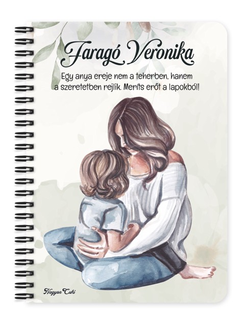 Névvel & Idézettel Kérhető Anya és Fia mintás Füzet | Névre Szóló Ajándék Anyáknak & Személyes Jegyzetfüzet | nagyoncuki.hu Gondoltál már arra, mennyi minden van egy Édesanya fejében? Bevásárlólisták, születésnapi dátumok, a gyerekek különórái, a karácsonyi menü, és ezer apró gondoskodó részlet, amivel a családot működteti. De hol van ebben a sok gondoskodásban Ő maga? Az Anyukák hajlamosak mindent és mindenkit maguk elé sorolni. Éppen ezért a legszebb ajándék, amit adhatsz neki, az a figyelem és a saját tér! Ezt az üzenetet zártuk ebbe a Családom Kollekciós Anya füzetbe. Ez a füzet nem csupán egy jegyzetfüzet. Ez egy főhajtás Anya előtt. Amikor kézbe veszi ezt a bájos, névre szóló füzetet, a rajta lévő kedves Anya figura emlékeztetni fogja: "Látjuk, mennyi mindent teszel értünk. Értékeljük a szeretetedet. Ez most a Te helyed, a Te gondolataidnak." A grafikán egy szeretnivaló, a Családom kollekcióra jellemző bájos anya karakter látható, aki a család melegét jelképezi. A személyre szabhatóság (név + esetleg egy rövid "Szeretünk, Anya" vagy "A legjobb Anya" felirat) pedig könnyekig ható ajándékká varázsolja ezt a hétköznapi tárgyat. Ezt a terméket mi, a nagyoncuki.hu csapata terveztük, hogy visszaadhassunk valamit abból a sok jóból, amit az édesanyák adnak a világnak. Miért válaszd ezt a személyre szabható szépséges anya mintás füzetet? Az "Énidő" szimbóluma: Ez a füzet csak az Övé. Nem a leckéé, nem a munkáé. Hanem az Ő álmaié, receptjeié vagy naplójáé. Érzelmi Elismerés: A minta és a névválasztás azt üzeni: "Te vagy a legfontosabb a Családban." Személyre szabható: Kérd az Édesanya keresztnevével, vagy "Anya", "Mama", "Nagyi" felirattal és ha akarod cseréld le az idézetet is! :) Praktikus és Minőségi: A füzet két méretben (A5 és A6) elérhető. A strapabíró spirálkötés és a 60 minőségi, vonalas lap (120 oldal) gondoskodik a kényelmes használatról. Extra Meglepetés: Minden füzethez egy ajándék post-it szett is jár, hogy a legfontosabb gondolatok mindig szem előtt lehessenek.Tökéletes Ajándék: Apák napjára, születésnapra, karácsonyra – vagy bármikor, amikor szeretnéd, hogy érezze a támogatásotokat. Tökéletes Ajándék: Anyák napjára, karácsonyra, születésnapra – vagy bármikor, amikor szeretnéd megköszönni, hogy Ő van nektek. Termékjellemzők: Méretek: Választható A5 (kb. 13,5 cm x 21 cm) vagy A6 (kb. 10,5 cm x 14,5 cm) Borító: Személyre szabható névvel és/vagy egyedi idézettel, matt felülettel Belső: Kb. 60 csíkos lap (120 oldal), tetején "memo" és "Subject" segédlettel Kötés: Praktikus és tartós fekete fémspirál Extra: Ajándék post-it szett a füzet elején Egyedi felirattal is kérhető: Ne felejtsd el megadni a kért nevet és/vagy az egyedi idézetet. Vidd haza ezt a szeretet-hordozó füzetet, és szerezz vele boldog pillanatokat a család lelkének! Ha tetszik neked ez az igazán aranyos dizájn, és tetszenek a személyre szabható ajándék ötleteink, nézd meg a Családom kollekciónkat is a nagyoncuki.hu-n!