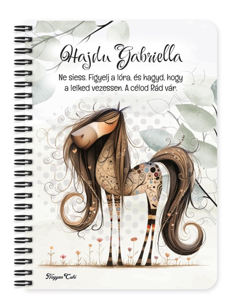 Személyre szabható - Kedves furi lovas Füzet | Egyedi Ajándék Lovas Rajongóknak, Nőknek & Személyes Napló | nagyoncuki.hu Képzeld el azt a mosolyt és inspirációt a megajándékozott arcán, amikor egy olyan füzetet tart a kezében, amely nemcsak a legféltettebb gondolatait, álmait vagy fontos jegyzeteit őrzi, hanem a lovas elegancia, a furik báj és a szabadság iránti szeretetét is tükrözi! Ez a különleges, személyre szabható, egyedi tervezésű bájos lovas füzet a könnyed elegancia, a játékos furcsaság és a nyugodt, elmélyült pillanatok bájos megtestesítője. Egy apró, szeretetteljes gesztus, amely a mindennapokat is fénnyel tölti meg, és minden lapon új ötletekre sarkall. Kiváló ajándék ötlet nőknek és mindenkinek, aki értékeli a személyes és lélekemelő meglepetéseket. Akár naplóként, jegyzetfüzetként, receptkönyvként vagy ötletfüzetként használod, ez a cuki füzet tökéletes társ lesz minden kreatív és meditatív pillanatban. Ezt a bájos füzetet mi magunk, a nagyoncuki.hu csapata terveztük, így biztos lehetsz benne, hogy egy igazi, nagy áruházakban nem kapható különlegességgel leped meg szeretteidet vagy magadat! :) Miért válaszd ezt a személyre szabható lovas füzetet? Teljesen Személyre Szabható: Tedd igazán a tiéddé! A borítóra nemcsak a nevedet kérheted, de egy saját, lélekemelő idézetet, verssort vagy egy fontos gondolatot is elhelyezhetsz rajta. Egyedi, Művészi Dizájn: A füzet designja szeretettel készült, kifejezetten az olvasás, a lovak és "a furik" kollekció szerelmesei számára. Igazi ajándék különlegesség. Praktikus és Minőségi: A füzet két méretben (A5 és A6) elérhető. A strapabíró spirálkötés és a 60 minőségi, vonalas lap (120 oldal) gondoskodik a kényelmes használatról. Extra Meglepetés: Minden füzethez egy ajándék post-it szett is jár, hogy a legfontosabb gondolatok mindig szem előtt lehessenek.