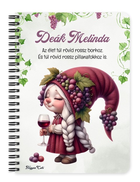Személyre szabható - Cuki borász manó lány mintás füzet mintás Füzet | Egyedi Ajándék Borászoknak & Borrajongóknak & Személyes Napló | nagyoncuki.hu Képzeld el, ahogy egy pohár finom bor mellett leülsz, hogy feljegyezd a gondolataidat, és a füzet borítójáról egy bölcs kis borász manó kacsint rád. Ő a telt ízek, a gondos munka és a baráti koccintások apró kis őrzője. Ez a személyre szabott füzet a tökéletes tisztelgés a borkészítés nemes mestersége és a borfogyasztás kultúrája előtt. Akár naplóként, jegyzetfüzetként, vagy ötletfüzetként használod, ez a manós mintás füzet tökéletes társ lesz minden pillanatban, amikor csak akarod. A "Cuki manók" kollekció ezen darabját is mi magunk, a nagyoncuki.hu csapata terveztük, így biztos lehetsz benne, hogy egy igazán egyedi és különleges manós ajándék darabbal leped meg szeretteidet vagy magadat. :) Miért válaszd ezt a cuki borász manó mintás füzetet? Teljesen Személyre Szabható: Tedd igazán egyedivé! A borítóra nemcsak nevet kérhetsz, de a mintán szereplő alap idézetet is lecserélheted egy saját, személyes és kedves üzenetre. Stílusos és Témába Vágó Dizájn: A cuki borász manó figura garantáltan mosolyt csal mindenki arcára, csak a kezében tartja. Praktikus és Minőségi: A füzet két méretben (A5 és A6) elérhető, így kiválaszthatod a neked legmegfelelőbbet. A strapabíró spirálkötés és a 60 minőségi, vonalas lap (120 oldal) gondoskodik a kényelmes használatról. Extra Meglepetés: Minden füzethez egy ajándék post-it szett is jár, hogy a legfontosabb jegyzetek mindig kéznél legyenek. Tökéletes Ajándék Borászoknak: Ideális ajándék születésnapra, névnapra, karácsonyra, apák napjára, vagy egy sikeres szüret megünneplésére. Kinek ideális ajándék ez a cuki borász manó mintás füzet? Minden borásznak, borrajongónak és borszakértőnek, aki komolyan veszi ezt a szép hobbit vagy hivatást. Azoknak, akiknek a borospince a szentélyük. Sommelier-knek, borkereskedőknek, akiknek a munkájuk a szenvedélyük. Házigazdáknak, egyedi ajándékként egy vacsorameghívásra, egy üveg bor mellé A Cuki Manók kollekció gyűjtőinek: Akik szeretnék bővíteni a bájos figurák gyűjteményét, és szeretik az összhangot. Hol használhatod a Cuki borász manó mintás füzetet? Otthon: Naplózáshoz, tervekhez, ötleteléshez, vagy akár csak bevásárlólistákhoz. Tökéletes az éjjeliszekrényre, az íróasztalra vagy a kanapé mellé. Irodában/Suliban: Jegyzeteléshez, határidők rögzítéséhez, vagy inspiráló segítőként a kreatív munkához. Dobd fel a mindennapi feladatokat. Ajándékként: Önmagában is egy csodás meglepetés, de akár egy manós vagy boros témájú ajándékcsomag részeként is tökéletes választás egy manós bögrével vagy poháralátéttel kiegészítve. Termékjellemzők: Méretek: Választható A5 (kb. 13,5 cm x 21 cm) vagy A6 (kb. 10,5 cm x 14,5 cm) Borító: Személyre szabható névvel és/vagy egyedi idézettel, matt felülettel Belső: Kb. 60 csíkos lap (120 oldal), tetején "memo" és "Subject" segédlettel Kötés: Praktikus és tartós fekete fémspirál Extra: Ajándék post-it szett a füzet elején Egyedi felirattal is kérhető: Ne felejtsd el megadni a kért nevet és/vagy az egyedi idézetet. Rendeld meg most ezt a teljesen személyre szabható, egyedi borász manós füzetet, és és ajándékozz egy igazán stílusos, szívhez szóló meglepetést!... mert mindenkinek jár egy kis cukiság! Ha Ha elvarázsolt a cuki manók világa, és tetszenek a személyre szabható ajándék ötleteink, nézd meg a többi aranyos manós dizájnnal készült termékünket is a "Cuki Manó" Kollekcióban a nagyoncuki.hu-n! Fedezz fel még több egyedi ajándékot és más, vidám témájú csodát!