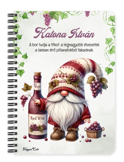 Személyre szabható - A legjobb borász manó és a vörös bor mintás füzet mintás Füzet | Egyedi Ajándék Borászoknak & Borrajongóknak & Személyes Napló | nagyoncuki.hu Képzeld el, ahogy egy pohár finom bor mellett leülsz, hogy feljegyezd a gondolataidat, és a füzet borítójáról egy bölcs kis borász manó kacsint rád. Ő a telt ízek, a gondos munka és a baráti koccintások apró kis őrzője. Ez a személyre szabott füzet a tökéletes tisztelgés a borkészítés nemes mestersége és a borfogyasztás kultúrája előtt. Akár naplóként, jegyzetfüzetként, vagy ötletfüzetként használod, ez a manós mintás füzet tökéletes társ lesz minden pillanatban, amikor csak akarod. A "Cuki manók" kollekció ezen darabját is mi magunk, a nagyoncuki.hu csapata terveztük, így biztos lehetsz benne, hogy egy igazán egyedi és különleges manós ajándék darabbal leped meg szeretteidet vagy magadat. :) Miért válaszd ezt a cuki borász manó mintás füzetet? Teljesen Személyre Szabható: Tedd igazán egyedivé! A borítóra nemcsak nevet kérhetsz, de a mintán szereplő alap idézetet is lecserélheted egy saját, személyes és kedves üzenetre. Stílusos és Témába Vágó Dizájn: A cuki borász manó figura garantáltan mosolyt csal mindenki arcára, csak a kezében tartja. Praktikus és Minőségi: A füzet két méretben (A5 és A6) elérhető, így kiválaszthatod a neked legmegfelelőbbet. A strapabíró spirálkötés és a 60 minőségi, vonalas lap (120 oldal) gondoskodik a kényelmes használatról. Extra Meglepetés: Minden füzethez egy ajándék post-it szett is jár, hogy a legfontosabb jegyzetek mindig kéznél legyenek. Tökéletes Ajándék Borászoknak: Ideális ajándék születésnapra, névnapra, karácsonyra, apák napjára, vagy egy sikeres szüret megünneplésére. Kinek ideális ajándék ez a cuki borász manó mintás füzet? Minden borásznak, borrajongónak és borszakértőnek, aki komolyan veszi ezt a szép hobbit vagy hivatást. Azoknak, akiknek a borospince a szentélyük. Sommelier-knek, borkereskedőknek, akiknek a munkájuk a szenvedélyük. Házigazdáknak, egyedi ajándékként egy vacsorameghívásra, egy üveg bor mellé A Cuki Manók kollekció gyűjtőinek: Akik szeretnék bővíteni a bájos figurák gyűjteményét, és szeretik az összhangot. Hol használhatod a Cuki borász manó mintás füzetet? Otthon: Naplózáshoz, tervekhez, ötleteléshez, vagy akár csak bevásárlólistákhoz. Tökéletes az éjjeliszekrényre, az íróasztalra vagy a kanapé mellé. Irodában/Suliban: Jegyzeteléshez, határidők rögzítéséhez, vagy inspiráló segítőként a kreatív munkához. Dobd fel a mindennapi feladatokat. Ajándékként: Önmagában is egy csodás meglepetés, de akár egy manós vagy boros témájú ajándékcsomag részeként is tökéletes választás egy manós bögrével vagy poháralátéttel kiegészítve. Termékjellemzők: Méretek: Választható A5 (kb. 13,5 cm x 21 cm) vagy A6 (kb. 10,5 cm x 14,5 cm) Borító: Személyre szabható névvel és/vagy egyedi idézettel, matt felülettel Belső: Kb. 60 csíkos lap (120 oldal), tetején "memo" és "Subject" segédlettel Kötés: Praktikus és tartós fekete fémspirál Extra: Ajándék post-it szett a füzet elején Egyedi felirattal is kérhető: Ne felejtsd el megadni a kért nevet és/vagy az egyedi idézetet. Rendeld meg most ezt a teljesen személyre szabható, egyedi borász manós füzetet, és és ajándékozz egy igazán stílusos, szívhez szóló meglepetést!... mert mindenkinek jár egy kis cukiság! Ha Ha elvarázsolt a cuki manók világa, és tetszenek a személyre szabható ajándék ötleteink, nézd meg a többi aranyos manós dizájnnal készült termékünket is a "Cuki Manó" Kollekcióban a nagyoncuki.hu-n! Fedezz fel még több egyedi ajándékot és más, vidám témájú csodát!