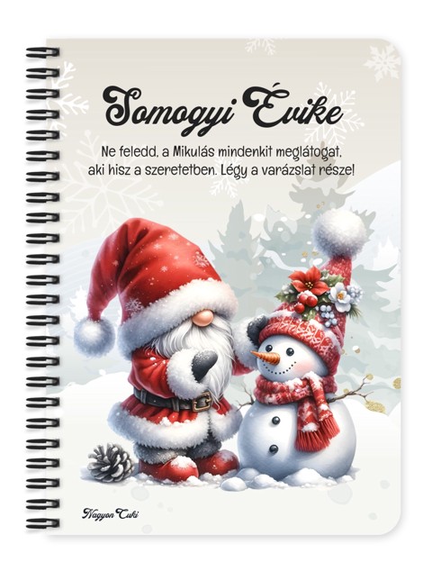 Névvel & Idézettel Kérhető Karácsonyi manó és a hóember mintás Füzet | Egyedi Karácsonyi Ajándék Nőknek & Személyes Napló, jegyzetfüzet | nagyoncuki.hu Képzeld el azt az ünnepi mosolyt és inspirációt a megajándékozott arcán, amikor egy olyan füzetet tart a kezében, amely nemcsak a karácsonyi terveit, receptjeit vagy fontos jegyzeteit őrzi, hanem a manók varázslatos karácsonyi világa iránti szeretetét is tükrözi! Ez a karácsonyi manós füzet a mesebeli békét, a karácsonyfa fényét és az ünnepi készülődés örömét ötvözi egy aranyos, ünnepi díszbe öltözött, tündéri manó figurájában. A dizájn kedves és egyedi, tökéletes ajándék ötlet azoknak, akik szeretik a különleges és szívhez szóló meglepetéseket, és imádják a személyes ajándékokat! :) A "Karácsonyi manók" kollekció ezen darabját is mi magunk, a nagyoncuki.hu csapata terveztük, így biztos lehetsz benne, hogy egy igazán egyedi, magyar és különleges karácsonyi ajándék darabbal leped meg szeretteidet vagy magadat! Miért válaszd ezt a személyre szabható a karácsonyi manó mintás füzetet? Teljesen Személyre Szabható: Tedd 100%-ban egyedivé! A borítóra nemcsak a nevedet kérheted, de a mintán szereplő alap idézetet is lecserélheted a saját, kedvenc motivációs üzenetedre vagy egy személyes gondolatra. Egyedi design: A füzet designja szeretettel készült, kifejezetten az ünnepek, a manók és a Cuki Manók kollekció szerelmesei számára. Igazi manós karácsonyi ajándék különlegesség. Praktikus és Minőségi: A füzet két méretben (A5 és A6) elérhető. A strapabíró spirálkötés és a 60 minőségi, vonalas lap (120 oldal) gondoskodik a kényelmes használatról. Extra Meglepetés: Minden füzethez egy ajándék post-it szett is jár, hogy a legfontosabb gondolatok mindig szem előtt lehessenek. Tökéletes ajándék nőknek, manórajongóknak és karácsonyra: Legyen szó születésnapról, névnapról, vagy a legfontosabb ünnepről, ez a névvel ellátott füzet mindig telitalálat! Kinek ideális ajándék ez a cuki karácsonyi manós mintás füzet? Nőknek és lányoknak: Mindenkinek, aki a manók, a mesék és a bájos, tündéri stílus rajongója. A karácsonyi készülődés kedvelőinek: Akik szeretnek tervezni, listákat írni, vagy épp az ünnepi gondolataikat papírra vetni. Egyedi és személyes ajándékot keresőknek: Ha valami igazán különlegeset és névre szólót szeretnél adni. Kollégáknak, barátoknak: Akiknek szeretnél egy vicces és személyes ajándékot adni, ami feldobja a munkanapokat. A Cuki Manók kollekció gyűjtőinek: Akik a már meglévő manós termékeikhez keresnek ünnepi kiegészítőt. Hol használhatod a Cuki karácsonyi manó mintás füzetet: Otthon: Karácsonyi receptek, ajándéklisták, ünnepi naplózáshoz. Tökéletes az íróasztalra vagy a karácsonyfa mellé Irodában/Suliban: Jegyzeteléshez, határidők rögzítéséhez – hogy az ünnepi hangulat a munkába is elkísérjen Ajándékként: Önmagában is egy csodás meglepetés, de akár egy karácsonyi ajándékcsomag részeként is tökéletes választás egy manós bögrével kiegészítve Termékjellemzők: Méretek: Választható A5 (kb. 13,5 cm x 21 cm) vagy A6 (kb. 10,5 cm x 14,5 cm) Borító: Személyre szabható névvel és/vagy egyedi idézettel, matt felülettel Belső: Kb. 60 csíkos lap (120 oldal), tetején "memo" és "Subject" segédlettel Kötés: Praktikus és tartós fekete fémspirál Extra: Ajándék post-it szett a füzet elején Egyedi felirattal is kérhető: Ne felejtsd el megadni a kért nevet és/vagy az egyedi idézetet a megjegyzés rovatban rendeléskor! Lepd meg a kedvenc hölgyedet, barátodat, családtagodat vagy saját magadat ezzel a bájos és személyre szabott cuki Karácsonyi Manó mintás füzettel!...mert mindenkinek jár egy kis cukiság. Ha elvarázsolt ez a tündéri dizájn, és tetszenek a személyre szabható ajándék ötleteink, nézd meg a többi aranyos manós cukiságunkat is a Cuki manók a nagyoncuki.hu-n!