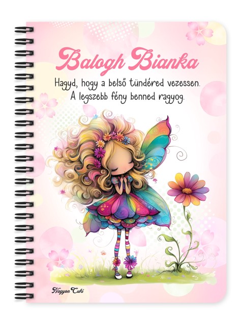 Személyre szabható - Cuki virág tündér mintás Füzet | Egyedi Ajándék & Személyes Napló | nagyoncuki.hu Gondoltál már arra, hogy a legzseniálisabb ötletek és a legmélyebb gondolatok ritkán születnek katonás rendben? A legszebb tervek és a legkreatívabb álmok sokszor pont olyan szertelenek és "bájosan ziláltak", mint a tavasz maga. A "Furik" kollekció tavaszi tündérei pontosan ezt a szabad, őszinte életörömet és alkotási vágyat testesítik meg! Ezt a személyre szabható Furi tavaszi tündér füzetet azért hoztuk létre mi, a nagyoncuki.hu csapata, hogy egy biztonságos, ítélkezésmentes helyet adjunk a gondolataidnak. Amikor ezt a füzetet adod ajándékba, valójában egy gyönyörű, érzelmi üzenetet közvetítesz. Az ajándék a szeretetünk és a támogatásunk látható hordozója, ez a szélkócos kis tündér pedig minden lapozásnál azt suttogja: "Higgy magadban! Írj, rajzolj, tervezz, hibázz és kezdd újra – mert a te történeted úgy csodálatos, ahogy van!" Miért válaszd ezt a személyre szabható bájos tündéres füzetet? Az Elfogadás és Kreativitás Szimbóluma: A "bájosan zilált" külső arra tanít, hogy a terveknek nem kell azonnal tökéletesnek lenniük. Tökéletes ajándék álmodozóknak, tervezőknek, vagy naplóírásra vágyó lányoknak, nőknek. Kettős Személyre Szabás: Tedd igazán egyedivé! A borítóra nemcsak a megajándékozott nevét kérheted, hanem egy saját, szívhez szóló vagy motiváló idézetet is. Praktikus és Minőségi: A füzet két méretben (A5 és A6) elérhető. A strapabíró spirálkötés és a 60 minőségi, vonalas lap (120 oldal) gondoskodik a kényelmes használatról. Extra Meglepetés: Minden füzethez egy ajándék post-it szett is jár, hogy a legfontosabb gondolatok mindig szem előtt lehessenek. Hol használhatod a furi, de cuki tündér mintás füzetet? Otthon: Naplózáshoz, receptek leírásához, ötleteléshez, vagy akár csak bevásárlólistákhoz. Tökéletes az éjjeliszekrényre, az íróasztalra vagy a kanapé mellé. Irodában/Suliban: Jegyzeteléshez, határidők rögzítéséhez, vagy inspiráló segítőként a kreatív munkához. Dobd fel a mindennapi feladatokat! Ajándékként: Önmagában is egy csodás meglepetés, de akár egy tündér témájú ajándékcsomag részeként is tökéletes választás egy furi, de cuki tündéres bögrével vagy poháralátéttel kiegészítve. Termékjellemzők: Méretek: Választható A5 (kb. 13,5 cm x 21 cm) vagy A6 (kb. 10,5 cm x 14,5 cm) Borító: Személyre szabható nevekkel és/vagy egyedi idézettel, matt felülettel Belső: Kb. 60 csíkos lap (120 oldal), tetején "memo" és "Subject" segédlettel Kötés: Praktikus és tartós fekete fémspirál Extra: Ajándék post-it szett a füzet végén Egyedi felirattal is kérhető: Ne felejtsd el megadni a kért neveket és/vagy az egyedi idézetet. Engedd el a tökéletesség iránti vágyat, és adj teret a varázslatnak! Rendeld meg ezt az egyedi, névre szóló Furi tündér füzetet, és ajándékozz vele szabad, alkotó pillanatokat!