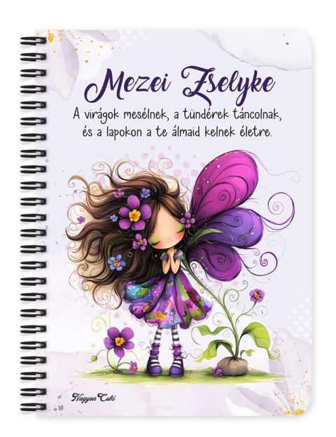 Személyre szabható - Cuki ibolya virágos tündér mintás Füzet | Egyedi Ajándék & Személyes Napló | nagyoncuki.hu Gondoltál már arra, hogy a legzseniálisabb ötletek és a legmélyebb gondolatok ritkán születnek katonás rendben? A legszebb tervek és a legkreatívabb álmok sokszor pont olyan szertelenek és "bájosan ziláltak", mint a tavasz maga. A "Furik" kollekció tavaszi tündérei pontosan ezt a szabad, őszinte életörömet és alkotási vágyat testesítik meg! Ezt a személyre szabható Furi tavaszi tündér füzetet azért hoztuk létre mi, a nagyoncuki.hu csapata, hogy egy biztonságos, ítélkezésmentes helyet adjunk a gondolataidnak. Amikor ezt a füzetet adod ajándékba, valójában egy gyönyörű, érzelmi üzenetet közvetítesz. Az ajándék a szeretetünk és a támogatásunk látható hordozója, ez a szélkócos kis tündér pedig minden lapozásnál azt suttogja: "Higgy magadban! Írj, rajzolj, tervezz, hibázz és kezdd újra – mert a te történeted úgy csodálatos, ahogy van!" Miért válaszd ezt a személyre szabható bájos tündéres füzetet? Az Elfogadás és Kreativitás Szimbóluma: A "bájosan zilált" külső arra tanít, hogy a terveknek nem kell azonnal tökéletesnek lenniük. Tökéletes ajándék álmodozóknak, tervezőknek, vagy naplóírásra vágyó lányoknak, nőknek. Kettős Személyre Szabás: Tedd igazán egyedivé! A borítóra nemcsak a megajándékozott nevét kérheted, hanem egy saját, szívhez szóló vagy motiváló idézetet is. Praktikus és Minőségi: A füzet két méretben (A5 és A6) elérhető. A strapabíró spirálkötés és a 60 minőségi, vonalas lap (120 oldal) gondoskodik a kényelmes használatról. Extra Meglepetés: Minden füzethez egy ajándék post-it szett is jár, hogy a legfontosabb gondolatok mindig szem előtt lehessenek. Hol használhatod a furi, de cuki tündér mintás füzetet? Otthon: Naplózáshoz, receptek leírásához, ötleteléshez, vagy akár csak bevásárlólistákhoz. Tökéletes az éjjeliszekrényre, az íróasztalra vagy a kanapé mellé. Irodában/Suliban: Jegyzeteléshez, határidők rögzítéséhez, vagy inspiráló segítőként a kreatív munkához. Dobd fel a mindennapi feladatokat! Ajándékként: Önmagában is egy csodás meglepetés, de akár egy tündér témájú ajándékcsomag részeként is tökéletes választás egy furi, de cuki tündéres bögrével vagy poháralátéttel kiegészítve. Termékjellemzők: Méretek: Választható A5 (kb. 13,5 cm x 21 cm) vagy A6 (kb. 10,5 cm x 14,5 cm) Borító: Személyre szabható nevekkel és/vagy egyedi idézettel, matt felülettel Belső: Kb. 60 csíkos lap (120 oldal), tetején "memo" és "Subject" segédlettel Kötés: Praktikus és tartós fekete fémspirál Extra: Ajándék post-it szett a füzet végén Egyedi felirattal is kérhető: Ne felejtsd el megadni a kért neveket és/vagy az egyedi idézetet. Engedd el a tökéletesség iránti vágyat, és adj teret a varázslatnak! Rendeld meg ezt az egyedi, névre szóló Furi tündér füzetet, és ajándékozz vele szabad, alkotó pillanatokat!
