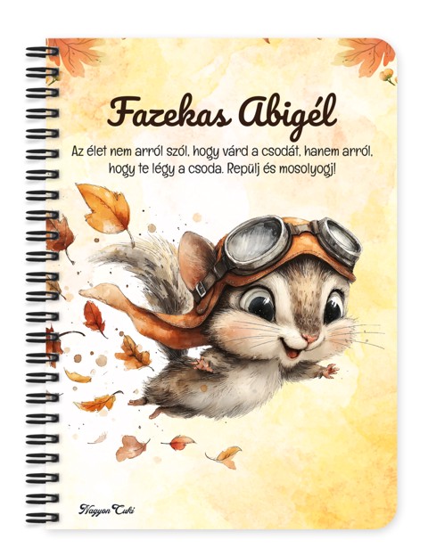 Névvel & Idézettel Kérhető Cuki őszi repülő mókus mintás Füzet | Ajándék ötlet Mókus rajongóknak & Napló, Jegyzetfüzet | nagyoncuki.hu Képzeld el azt a mosolyt és a játékos hangulatot, amikor egy olyan füzetet tartasz a kezedben, amely nemcsak a teendőid és jegyzeteid rendszerezésére szolgál, hanem a mókusok ravasz báját, az őszi kalandot és a szabadság örömét is tükrözi! Ez a különleges, névre szóló, egyedi tervezésű őszi mókus füzet a kényelmes pihenés, a kreativitás és az Erdei Varázs kollekció elragadó megtestesítője. Egy apró, szeretetteljes gesztus, amely a tanulást, a munkát és a jegyzetelést is fénnyel tölti meg, inspirációt adva minden sorhoz. Kiváló ajándék ötlet mindenkinek – legyen szó nőről, férfiról, vagy diákról – aki értékeli a személyes és lélekemelő meglepetéseket! Miért válaszd ezt a személyre szabható az őszi mókus mintás füzetet? Teljesen Személyre Szabható: Tedd még különlegesebbé az ajándékot a megajándékozott nevével! Egy igazán névre szóló füzet élmény, ami azt üzeni: "Ez csak a tied, szárnyalj vele! Egyedi design: A füzet designja szeretettel készült, kifejezetten a mókusok, az őszi kaland és az Erdei Varázs kollekció szerelmesei számára. Igazi mókusos ajándék különlegesség!. Praktikus és Minőségi: A füzet két méretben (A5 és A6) elérhető. A strapabíró spirálkötés és a 60 minőségi, vonalas lap (120 oldal) gondoskodik a kényelmes használatról. Extra Meglepetés: Minden füzethez egy ajándék post-it szett is jár, hogy a legfontosabb gondolatok mindig szem előtt lehessenek. Tökéletes ajándék mindenkinek: Legyen szó iskolakezdésről, születésnapról, névnapról, vagy karácsonyról, ez a névvel ellátott füzet mindig telitalálat! Kinek ideális ajándék ez a cuki őszi mókus mintás füzet? Mókus Rajongóknak és a Szabadság Kedvelőinek: Mindenkinek, aki a mókusokat, az erdei állatokat és a bájos, Erdei Varázs stílus rajongója. A tanulás, tervezés és jegyzetelés kedvelőinek: Akik szeretnék rendszerezni a gondolataikat és teendőiket egy szép füzetben Egyedi és személyes ajándékot keresőknek: Ha valami igazán különlegeset és névre szólót szeretnél adni. Hol használhatod a Cuki őszi mókus mintás füzetet: Otthon:Naplóírásra, jegyzetelésre, receptek gyűjtésére, vagy őszi teendők listázására. Irodában/Suliban: Jegyzeteléshez, határidők rögzítéséhez – hogy az ünnepi hangulat a munkába is elkísérjen. Ajándékként: Önmagában is egy csodás meglepetés, de akár egy mókusos ajándékcsomag részeként is tökéletes választás. Termékjellemzők: Méretek: Választható A5 (kb. 13,5 cm x 21 cm) vagy A6 (kb. 10,5 cm x 14,5 cm) Borító: Személyre szabható névvel és/vagy egyedi idézettel, matt felülettel Belső: Kb. 60 csíkos lap (120 oldal), tetején "memo" és "Subject" segédlettel Kötés: Praktikus és tartós fekete fémspirál Extra: Ajándék post-it szett a füzet elején Egyedi felirattal is kérhető: Ne felejtsd el megadni a kért nevet és/vagy az egyedi idézetet a megjegyzés rovatban rendeléskor! Lepd meg a szerettedet, barátodat, kollégádat vagy saját magadat ezzel a bájos és személyre szabott füzettel! Rendeld meg most ezt az egyedi, névre szóló mókusos füzetet, és vigyél egy kis extra őszi örömet és inspirációt a mindennapokba!...mert mindenkinek jár egy kis cukiság. Ha tetszik neked ez az igazán aranyos dizájn, és tetszenek a személyre szabható ajándék ötleteink, nézd meg az Erdei varázs kollekciónkat is a nagyoncuki.hu-n!