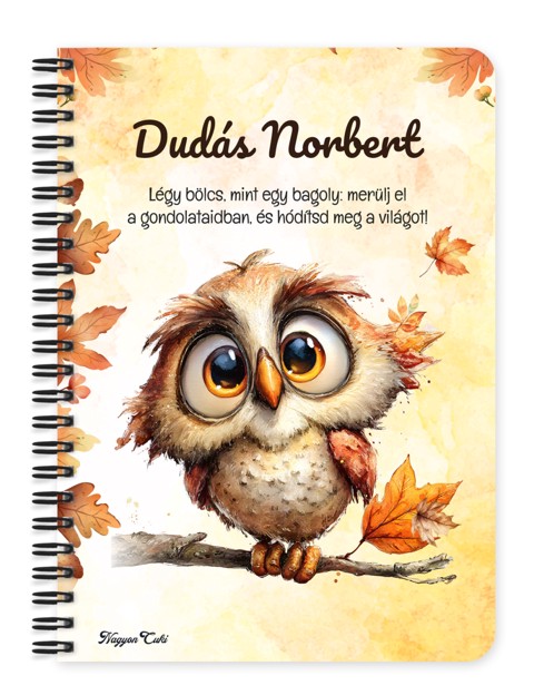 Névvel & Idézettel Kérhető Cuki őszi bagoly fiú mintás Füzet | Legjobb ajándék ötlet bagoly rajongóknak & Személyes Napló, jegyzetfüzet | nagyoncuki.hu Képzeld el azt a mosolyt és inspirációt, amikor egy olyan füzetet tartasz a kezedben, amely nemcsak a teendőid és jegyzeteid rendszerezésére szolgál, hanem a baglyok bölcs báját, az őszi meghittséget és a tudás iránti szeretetet is tükrözi! Ez a különleges, névre szóló, egyedi tervezésű őszi baglyos füzet a rendszerezés, a kreativitás és az Erdei Varázs kollekció elragadó megtestesítője. Egy apró, szeretetteljes gesztus, amely a tanulást, a munkát és a jegyzetelést is fénnyel tölti meg, inspirációt adva minden sorhoz. Kiváló ajándék ötlet mindenkinek, aki értékeli a személyes és lélekemelő meglepetéseket! Ezt a bájos füzetet mi magunk, a nagyoncuki.hu csapata terveztük, így biztos lehetsz benne, hogy egy igazán egyedi, magyar és személyre szabható ajándék darabbal leped meg szeretteidet vagy magadat! Miért válaszd ezt a személyre szabható az őszi bagoly mintás füzetet? Teljesen Személyre Szabható: Tedd még különlegesebbé az ajándékot a megajándékozott nevével! Egy igazán névre szóló füzet élmény, ami azt üzeni: "Ez csak a tied, írd a saját történeted! Egyedi design: A füzet designja szeretettel készült, kifejezetten a baglyok, az őszi hangulat és az Erdei Varázs kollekció szerelmesei számára. Igazi baglyos ajándék különlegesség. Praktikus és Minőségi: A füzet két méretben (A5 és A6) elérhető. A strapabíró spirálkötés és a 60 minőségi, vonalas lap (120 oldal) gondoskodik a kényelmes használatról. Extra Meglepetés: Minden füzethez egy ajándék post-it szett is jár, hogy a legfontosabb gondolatok mindig szem előtt lehessenek. Tökéletes ajándék mindenkinek: Legyen szó iskolakezdésről, születésnapról, névnapról, vagy karácsonyról, ez a névvel ellátott füzet mindig telitalálat! Kinek ideális ajándék ez a cuki őszi bagoly mintás füzet? Diákoknak és Tanároknak: A bölcs bagoly motívum miatt ideális a tanuláshoz és a rendszerezéshez.. Nőknek és Férfiaknak: Mindenkinek, aki a baglyokat, az erdei állatokat és a bájos, Erdei Varázs stílus rajongója. A tanulás, tervezés és jegyzetelés kedvelőinek: Akik szeretnék rendszerezni a gondolataikat és teendőiket egy szép füzetben Egyedi és személyes ajándékot keresőknek: Ha valami igazán különlegeset és névre szólót szeretnél adni. Hol használhatod a Cuki őszi bagoly mintás füzetet: Otthon:Naplóírásra, jegyzetelésre, receptek gyűjtésére, vagy őszi teendők listázására. Irodában/Suliban: Jegyzeteléshez, határidők rögzítéséhez – hogy az ünnepi hangulat a munkába is elkísérjen. Ajándékként: Önmagában is egy csodás meglepetés, de akár egy baglyos ajándékcsomag részeként is tökéletes választás egy macis bögrével kiegészítve. Termékjellemzők: Méretek: Választható A5 (kb. 13,5 cm x 21 cm) vagy A6 (kb. 10,5 cm x 14,5 cm) Borító: Személyre szabható névvel és/vagy egyedi idézettel, matt felülettel Belső: Kb. 60 csíkos lap (120 oldal), tetején "memo" és "Subject" segédlettel Kötés: Praktikus és tartós fekete fémspirál Extra: Ajándék post-it szett a füzet elején Egyedi felirattal is kérhető: Ne felejtsd el megadni a kért nevet és/vagy az egyedi idézetet a megjegyzés rovatban rendeléskor! Lepd meg a szerettedet, barátodat, kollégádat vagy saját magadat ezzel a bájos és személyre szabott füzettel! Rendeld meg most ezt az egyedi, névre szóló baglyos füzetet, és vigyél egy kis extra őszi örömet és inspirációt a mindennapokba!...mert mindenkinek jár egy kis cukiság. Ha tetszik neked ez az igazán aranyos dizájn, és tetszenek a személyre szabható ajándék ötleteink, nézd meg az Erdei varázs kollekciónkat is a nagyoncuki.hu-n!