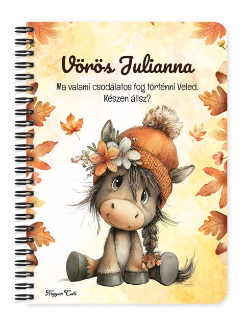Névvel & Idézettel Kérhető Cuki őszi póni csüccs lovas mintás Füzet | Névre Szóló Lovas Ajándék & Személyes Jegyzetfüzet | nagyoncuki.hu Képzeld el azt a mosolyt és a vidám hangulatot, amikor egy olyan füzetet tartasz a kezedben, amely nemcsak a teendőid és jegyzeteid rendszerezésére szolgál, hanem a pónik játékos báját, az őszi romantikát és a lovak iránti mély szeretetet is tükrözi! Ez a különleges, névre szóló, egyedi tervezésű őszi póni lovas füzet a könnyedség, a kreativitás és az Erdei Varázs kollekció elragadó megtestesítője. Egy apró, szeretetteljes gesztus, amely a tanulást, a munkát és a jegyzetelést is fénnyel tölti meg, inspirációt adva minden sorhoz. Kiváló ajándék ötlet nőknek és lovas lányoknak, akik értékelik a személyes és lélekemelő meglepetéseket! Ezt a bájos füzetet mi magunk, a nagyoncuki.hu csapata terveztük, így biztos lehetsz benne, hogy egy igazán egyedi, magyar és személyre szabható ajándék darabbal leped meg szeretteidet vagy magadat! Miért válaszd ezt a személyre szabható az őszi póni lovas mintás füzetet? Teljesen Személyre Szabható: Tedd még különlegesebbé az ajándékot a megajándékozott nevével! Egy igazán névre szóló füzet élmény, ami azt üzeni: "Ez csak a tied, írd a saját történeted! Egyedi design: A füzet designja szeretettel készült, kifejezetten a pónik, a lovak és az Erdei Varázs kollekció szerelmesei számára. Igazi lovas ajándék különlegesség. Praktikus és Minőségi: A füzet két méretben (A5 és A6) elérhető. A strapabíró spirálkötés és a 60 minőségi, vonalas lap (120 oldal) gondoskodik a kényelmes használatról. Extra Meglepetés: Minden füzethez egy ajándék post-it szett is jár, hogy a legfontosabb gondolatok mindig szem előtt lehessenek. Tökéletes ajándék mindenkinek: Legyen szó iskolakezdésről, születésnapról, névnapról, vagy karácsonyról, vagy egy kedves gesztusról, ez a névvel ellátott füzet mindig telitalálat! Kinek ideális ajándék ez a cuki őszi póni lovas mintás füzet? Nőknek és Lányoknak: Mindenkinek, aki a pónikat, a lovakat és a bájos, Erdei Varázs stílus rajongója. A lovaglás, a természet és a tervezés kedvelőinek: Akik szeretnék rendszerezni a gondolataikat és teendőiket egy szép őszi jegyzetfüzetben A tanulás, tervezés és jegyzetelés kedvelőinek: Akik szeretnék rendszerezni a gondolataikat és teendőiket egy szép füzetben Egyedi és személyes ajándékot keresőknek: Ha valami igazán különlegeset és névre szólót szeretnél adni. Hol használhatod a Cuki őszi póni lovas mintás füzetet: Otthon:Naplóírásra, jegyzetelésre, receptek gyűjtésére, vagy őszi teendők listázására. Irodában/Suliban: Jegyzeteléshez, határidők rögzítéséhez – hogy az ünnepi hangulat a munkába is elkísérjen. Ajándékként: Önmagában is egy csodás meglepetés, de akár egy lovas ajándékcsomag részeként is tökéletes választás egy macis bögrével kiegészítve. Termékjellemzők: Méretek: Választható A5 (kb. 13,5 cm x 21 cm) vagy A6 (kb. 10,5 cm x 14,5 cm) Borító: Személyre szabható névvel és/vagy egyedi idézettel, matt felülettel Belső: Kb. 60 csíkos lap (120 oldal), tetején "memo" és "Subject" segédlettel Kötés: Praktikus és tartós fekete fémspirál Extra: Ajándék post-it szett a füzet elején Egyedi felirattal is kérhető: Ne felejtsd el megadni a kért nevet és/vagy az egyedi idézetet a megjegyzés rovatban rendeléskor! Lepd meg a szerettedet, barátodat, kollégádat vagy saját magadat ezzel a bájos és személyre szabott füzettel! Rendeld meg most ezt az egyedi, névre szóló póni lovas füzetet, és vigyél egy kis extra őszi örömet és inspirációt a mindennapokba!...mert mindenkinek jár egy kis cukiság. Ha tetszik neked ez az igazán aranyos dizájn, és tetszenek a személyre szabható ajándék ötleteink, nézd meg az Erdei varázs kollekciónkat is a nagyoncuki.hu-n!