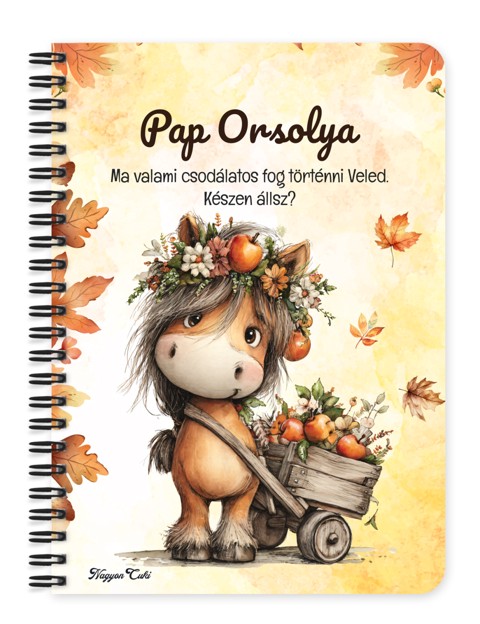 Névvel & Idézettel Kérhető Cuki őszi póni almával lovas mintás Füzet | Névre Szóló Lovas Ajándék & Személyes Jegyzetfüzet | nagyoncuki.hu Képzeld el azt a mosolyt és a vidám hangulatot, amikor egy olyan füzetet tartasz a kezedben, amely nemcsak a teendőid és jegyzeteid rendszerezésére szolgál, hanem a pónik játékos báját, az őszi romantikát és a lovak iránti mély szeretetet is tükrözi! Ez a különleges, névre szóló, egyedi tervezésű őszi póni lovas füzet a könnyedség, a kreativitás és az Erdei Varázs kollekció elragadó megtestesítője. Egy apró, szeretetteljes gesztus, amely a tanulást, a munkát és a jegyzetelést is fénnyel tölti meg, inspirációt adva minden sorhoz. Kiváló ajándék ötlet nőknek és lovas lányoknak, akik értékelik a személyes és lélekemelő meglepetéseket! Ezt a bájos füzetet mi magunk, a nagyoncuki.hu csapata terveztük, így biztos lehetsz benne, hogy egy igazán egyedi, magyar és személyre szabható ajándék darabbal leped meg szeretteidet vagy magadat! Miért válaszd ezt a személyre szabható az őszi póni lovas mintás füzetet? Teljesen Személyre Szabható: Tedd még különlegesebbé az ajándékot a megajándékozott nevével! Egy igazán névre szóló füzet élmény, ami azt üzeni: "Ez csak a tied, írd a saját történeted! Egyedi design: A füzet designja szeretettel készült, kifejezetten a pónik, a lovak és az Erdei Varázs kollekció szerelmesei számára. Igazi lovas ajándék különlegesség. Praktikus és Minőségi: A füzet két méretben (A5 és A6) elérhető. A strapabíró spirálkötés és a 60 minőségi, vonalas lap (120 oldal) gondoskodik a kényelmes használatról. Extra Meglepetés: Minden füzethez egy ajándék post-it szett is jár, hogy a legfontosabb gondolatok mindig szem előtt lehessenek. Tökéletes ajándék mindenkinek: Legyen szó iskolakezdésről, születésnapról, névnapról, vagy karácsonyról, vagy egy kedves gesztusról, ez a névvel ellátott füzet mindig telitalálat! Kinek ideális ajándék ez a cuki őszi póni lovas mintás füzet? Nőknek és Lányoknak: Mindenkinek, aki a pónikat, a lovakat és a bájos, Erdei Varázs stílus rajongója. A lovaglás, a természet és a tervezés kedvelőinek: Akik szeretnék rendszerezni a gondolataikat és teendőiket egy szép őszi jegyzetfüzetben A tanulás, tervezés és jegyzetelés kedvelőinek: Akik szeretnék rendszerezni a gondolataikat és teendőiket egy szép füzetben Egyedi és személyes ajándékot keresőknek: Ha valami igazán különlegeset és névre szólót szeretnél adni. Hol használhatod a Cuki őszi póni lovas mintás füzetet: Otthon:Naplóírásra, jegyzetelésre, receptek gyűjtésére, vagy őszi teendők listázására. Irodában/Suliban: Jegyzeteléshez, határidők rögzítéséhez – hogy az ünnepi hangulat a munkába is elkísérjen. Ajándékként: Önmagában is egy csodás meglepetés, de akár egy lovas ajándékcsomag részeként is tökéletes választás egy macis bögrével kiegészítve. Termékjellemzők: Méretek: Választható A5 (kb. 13,5 cm x 21 cm) vagy A6 (kb. 10,5 cm x 14,5 cm) Borító: Személyre szabható névvel és/vagy egyedi idézettel, matt felülettel Belső: Kb. 60 csíkos lap (120 oldal), tetején "memo" és "Subject" segédlettel Kötés: Praktikus és tartós fekete fémspirál Extra: Ajándék post-it szett a füzet elején Egyedi felirattal is kérhető: Ne felejtsd el megadni a kért nevet és/vagy az egyedi idézetet a megjegyzés rovatban rendeléskor! Lepd meg a szerettedet, barátodat, kollégádat vagy saját magadat ezzel a bájos és személyre szabott füzettel! Rendeld meg most ezt az egyedi, névre szóló póni lovas füzetet, és vigyél egy kis extra őszi örömet és inspirációt a mindennapokba!...mert mindenkinek jár egy kis cukiság. Ha tetszik neked ez az igazán aranyos dizájn, és tetszenek a személyre szabható ajándék ötleteink, nézd meg az Erdei varázs kollekciónkat is a nagyoncuki.hu-n!