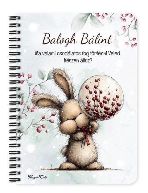 Névvel & Idézettel Kérhető Cuki téli nyuszi gömbbel Füzet / Napló | Névre Szóló téli Ajándék & Személyes Jegyzetfüzet | nagyoncuki.hu Képzeld el azt a mosolyt és az ünnepi ihletet, amikor egy olyan füzetet tartasz a kezedben, amely nemcsak a teendőid és jegyzeteid rendszerezésére szolgál, hanem az ünnepi készülődés örömét is tükrözi! Ez a különleges, névre szóló, egyedi tervezésű Cuki téli nyuszi füzet a meghitt kuckózás, a kreativitás és az Erdei Varázs kollekció elragadó ünnepi darabja. Egy apró, szeretetteljes gesztus, amely a tervezést, a munkát és a jegyzetelést is fénnyel tölti meg, inspirációt adva minden sorhoz. Kiváló ajándék ötlet karácsonyra – legyen szó nőről, férfiról, vagy gyermekről – aki értékeli a személyes és lélekemelő meglepetéseket! Ezt a bájos füzetet mi magunk, a nagyoncuki.hu csapata terveztük, így biztos lehetsz benne, hogy egy igazán egyedi, magyar és személyre szabható ajándék darabbal leped meg szeretteidet vagy magadat! Miért válaszd ezt a személyre szabható a cuki téli nyuszi mintás füzetet? Egyedi Ünnepi Design: A füzet designja szeretettel készült, kifejezetten a nyuszi, a karácsony és az Erdei Varázs kollekció szerelmesei számára. Igazi téli ajándék különlegesség! Személyre szabható: Tedd még különlegesebbé az ajándékot a megajándékozott nevével! Egy igazán névre szóló füzet élmény, ami azt üzeni: "Ez csak a tied, tervezd meg benne a csodát!". Praktikus és Minőségi: A füzet két méretben (A5 és A6) elérhető. A strapabíró spirálkötés és a 60 minőségi, vonalas lap (120 oldal) gondoskodik a kényelmes használatról. Extra Meglepetés: Minden füzethez egy ajándék post-it szett is jár, hogy a legfontosabb gondolatok mindig szem előtt lehessenek. Tökéletes Ajándék Karácsonyra: Legyen szó Mikulásról, téli meglepetésről, ez a névvel ellátott füzet mindig telitalálat! Kinek ideális ajándék ez a cuki téli nyuszi mintás füzet? Nyuszi Rajongóknak és a Készülődés Kedvelőinek: Mindenkinek, aki az állatokat, az ünnepet és a bájos, Erdei Varázs stílus rajongója. A Tervezés és Naplóírás Kedvelőinek:Akik szeretnék rendszerezni a gondolataikat, ajándéklistájukat egy szép téli jegyzetfüzetben. Egyedi és személyes ajándékot keresőknek: Ha valami igazán különlegeset és névre szólót szeretnél adni. Hol használhatod ezt a cuki téli nyuszi mintás füzetet: téli Készülődés: Menü, ajándéklista, vendéglista írására Otthon: Naplóírásra, jegyzetelésre, receptek gyűjtésére vagy ünnepi emlékek, élmények rögzítésére. Irodában/Suliban: Jegyzeteléshez, határidők rögzítéséhez – hogy az ünnepi hangulat a munkába is elkísérjen. Termékjellemzők: Méretek: Választható A5 (kb. 13,5 cm x 21 cm) vagy A6 (kb. 10,5 cm x 14,5 cm) Borító: Személyre szabható névvel és/vagy egyedi idézettel, matt felülettel Belső: Kb. 60 csíkos lap (120 oldal), tetején "memo" és "Subject" segédlettel Kötés: Praktikus és tartós fekete fémspirál Extra: Ajándék post-it szett a füzet elején Egyedi felirattal is kérhető: Ne felejtsd el megadni a kért nevet és/vagy az egyedi idézetet a megjegyzés rovatban rendeléskor! Lepd meg a szerettedet, barátodat, kollégádat vagy saját magadat ezzel a bájos és személyre szabott füzettel! Rendeld meg most ezt az egyedi, névre szóló téli nyuszis füzetet, és vigyél egy kis extra téli örömet és inspirációt a mindennapokba!...mert mindenkinek jár egy kis cukiság. Ha tetszik neked ez az igazán aranyos dizájn, és tetszenek a személyre szabható ajándék ötleteink, nézd meg az Erdei varázs kollekciónkat is a nagyoncuki.hu-n!