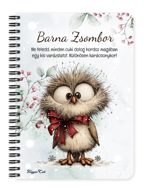 Névvel & Idézettel Kérhető Cuki téli bagoly masnival Füzet / Napló | Névre Szóló téli Ajándék & Személyes Jegyzetfüzet | nagyoncuki.hu Képzeld el azt a mosolyt és az ünnepi ihletet, amikor egy olyan füzetet tartasz a kezedben, amely nemcsak a teendőid és jegyzeteid rendszerezésére szolgál, hanem az ünnepi készülődés örömét is tükrözi! Ez a különleges, névre szóló, egyedi tervezésű Cuki téli bagoly füzet a meghitt kuckózás, a kreativitás és az Erdei Varázs kollekció elragadó ünnepi darabja. Egy apró, szeretetteljes gesztus, amely a tervezést, a munkát és a jegyzetelést is fénnyel tölti meg, inspirációt adva minden sorhoz. Kiváló ajándék ötlet karácsonyra – legyen szó nőről, férfiról, vagy gyermekről – aki értékeli a személyes és lélekemelő meglepetéseket! Ezt a bájos füzetet mi magunk, a nagyoncuki.hu csapata terveztük, így biztos lehetsz benne, hogy egy igazán egyedi, magyar és személyre szabható ajándék darabbal leped meg szeretteidet vagy magadat! Miért válaszd ezt a személyre szabható a cuki téli bagoly mintás füzetet? Egyedi Ünnepi Design: A füzet designja szeretettel készült, kifejezetten a bagoly, a karácsony és az Erdei Varázs kollekció szerelmesei számára. Igazi téli ajándék különlegesség! Személyre szabható: Tedd még különlegesebbé az ajándékot a megajándékozott nevével! Egy igazán névre szóló füzet élmény, ami azt üzeni: "Ez csak a tied, tervezd meg benne a csodát!". Praktikus és Minőségi: A füzet két méretben (A5 és A6) elérhető. A strapabíró spirálkötés és a 60 minőségi, vonalas lap (120 oldal) gondoskodik a kényelmes használatról. Extra Meglepetés: Minden füzethez egy ajándék post-it szett is jár, hogy a legfontosabb gondolatok mindig szem előtt lehessenek. Tökéletes Ajándék Karácsonyra: Legyen szó Mikulásról, téli meglepetésről, ez a névvel ellátott füzet mindig telitalálat! Kinek ideális ajándék ez a cuki téli bagoly mintás füzet? Bagoly Rajongóknak és a Készülődés Kedvelőinek: Mindenkinek, aki az állatokat, az ünnepet és a bájos, Erdei Varázs stílus rajongója. A Tervezés és Naplóírás Kedvelőinek:Akik szeretnék rendszerezni a gondolataikat, ajándéklistájukat egy szép téli jegyzetfüzetben. Egyedi és személyes ajándékot keresőknek: Ha valami igazán különlegeset és névre szólót szeretnél adni. Hol használhatod ezt a cuki téli bagoly mintás füzetet: téli Készülődés: Menü, ajándéklista, vendéglista írására Otthon: Naplóírásra, jegyzetelésre, receptek gyűjtésére vagy ünnepi emlékek, élmények rögzítésére. Irodában/Suliban: Jegyzeteléshez, határidők rögzítéséhez – hogy az ünnepi hangulat a munkába is elkísérjen. Termékjellemzők: Méretek: Választható A5 (kb. 13,5 cm x 21 cm) vagy A6 (kb. 10,5 cm x 14,5 cm) Borító: Személyre szabható névvel és/vagy egyedi idézettel, matt felülettel Belső: Kb. 60 csíkos lap (120 oldal), tetején "memo" és "Subject" segédlettel Kötés: Praktikus és tartós fekete fémspirál Extra: Ajándék post-it szett a füzet elején Egyedi felirattal is kérhető: Ne felejtsd el megadni a kért nevet és/vagy az egyedi idézetet a megjegyzés rovatban rendeléskor! Lepd meg a szerettedet, barátodat, kollégádat vagy saját magadat ezzel a bájos és személyre szabott füzettel! Rendeld meg most ezt az egyedi, névre szóló téli bagoly füzetet, és vigyél egy kis extra téli örömet és inspirációt a mindennapokba!...mert mindenkinek jár egy kis cukiság. Ha tetszik neked ez az igazán aranyos dizájn, és tetszenek a személyre szabható ajándék ötleteink, nézd meg az Erdei varázs kollekciónkat is a nagyoncuki.hu-n!