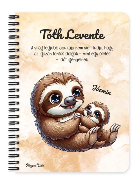 Névvel & Idézettel Kérhető Cuki lajhár Apa és kicsi lajhárja mintás Füzet | Névre Szóló Ajándék Apáknak & Személyes Jegyzetfüzet | nagyoncuki.hu Képzeld el Apát egy nehéz munkanapon, vagy amikor épp a család jövőjét tervezi. Kiveszi a táskájából ezt a füzetet, és mielőtt kinyitná, megpillantja a borítót: a nagy, erős lajhárt (Önmagát), akin ott lógnak a kis lajhárok (a Ti gyermekeitek), és alatta az az idézet, amit Ti választottatok neki. Abban a pillanatban a munka nem csak munka többé. Hanem cél. Mert eszébe jut, hogy kikért csinálja mindezt! Ezt a mindennapi erőt és motivációt zártuk ebbe a Cuki Lajhár Apa füzetbe. Ez a füzet a "Biztonságos Fa" szimbóluma. Azt üzeni, hogy bárhogy is pörög a világ, Apa nyugalma és szeretete az, ami összetartja a családot! A grafikán a büszke apa lajhár látható az ölelő kicsikkel. A személyre szabható idézet (pl. "A világ legjobb Apukájának" vagy "Te vagy a mi hősünk") pedig megkoronázza az ajándékot. Ezt a terméket mi, a nagyoncuki.hu csapata terveztük, hogy Apa minden gondolata és terve a legjobb helyen legyen Miért válaszd ezt a személyre szabható lajhár apa mintás füzetet? Kettős Személyre Szabás: Nemcsak a neveket kérheted rá (Apa + Gyerekek), hanem egy egyedi idézetet vagy üzenetet is! Így válik ez a füzet egy személyes levéllé, amit mindig magánál hordhat. Motiváció a hétköznapokban: Legyen szó munkahelyi értekezletről vagy otthoni barkácstervekről, ez a füzet mindig emlékezteti a legfontosabbakra Praktikus és Minőségi: A füzet két méretben (A5 és A6) elérhető. A strapabíró spirálkötés és a 60 minőségi, vonalas lap (120 oldal) gondoskodik a kényelmes használatról. Extra Meglepetés: Minden füzethez egy ajándék post-it szett is jár, hogy a legfontosabb gondolatok mindig szem előtt lehessenek.Tökéletes Ajándék: Apák napjára, születésnapra, karácsonyra – vagy bármikor, amikor szeretnéd, hogy érezze a támogatásotokat. Termékjellemzők: Méretek: Választható A5 (kb. 13,5 cm x 21 cm) vagy A6 (kb. 10,5 cm x 14,5 cm) Borító: Személyre szabható névvel és/vagy egyedi idézettel, matt felülettel Belső: Kb. 60 csíkos lap (120 oldal), tetején "memo" és "Subject" segédlettel Kötés: Praktikus és tartós fekete fémspirál Extra: Ajándék post-it szett a füzet elején Egyedi felirattal is kérhető: Ne felejtsd el megadni a kért nevet és/vagy az egyedi idézetet. Vidd haza ezt a szeretet-hordozó füzetet, és adj Apának helyet a nagy tervekhez és a szép emlékekhez! Ha tetszik neked ez az igazán aranyos dizájn, és tetszenek a személyre szabható ajándék ötleteink, nézd meg a Cuki lajhárok kollekciónkat is a nagyoncuki.hu-n!
