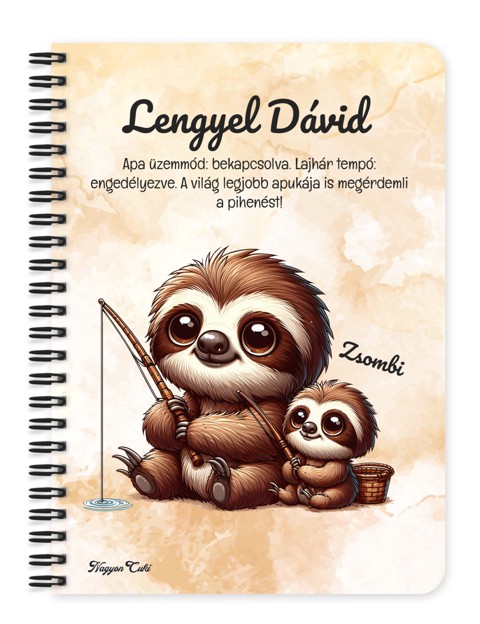 Névvel & Idézettel Kérhető Cuki lajhár Apa és gyermeke horgásznak mintás Füzet | Névre Szóló Ajándék Apáknak & Személyes Jegyzetfüzet | nagyoncuki.hu Képzeld el Apát egy nehéz munkanapon, vagy amikor épp a család jövőjét tervezi. Kiveszi a táskájából ezt a füzetet, és mielőtt kinyitná, megpillantja a borítót: a nagy, erős lajhárt (Önmagát), akin ott lógnak a kis lajhárok (a Ti gyermekeitek), és alatta az az idézet, amit Ti választottatok neki. Abban a pillanatban a munka nem csak munka többé. Hanem cél. Mert eszébe jut, hogy kikért csinálja mindezt! Ezt a mindennapi erőt és motivációt zártuk ebbe a Cuki Lajhár Apa füzetbe. Ez a füzet a "Biztonságos Fa" szimbóluma. Azt üzeni, hogy bárhogy is pörög a világ, Apa nyugalma és szeretete az, ami összetartja a családot! A grafikán a büszke apa lajhár látható az ölelő kicsikkel. A személyre szabható idézet (pl. "A világ legjobb Apukájának" vagy "Te vagy a mi hősünk") pedig megkoronázza az ajándékot. Ezt a terméket mi, a nagyoncuki.hu csapata terveztük, hogy Apa minden gondolata és terve a legjobb helyen legyen Miért válaszd ezt a személyre szabható lajhár apa mintás füzetet? Kettős Személyre Szabás: Nemcsak a neveket kérheted rá (Apa + Gyerekek), hanem egy egyedi idézetet vagy üzenetet is! Így válik ez a füzet egy személyes levéllé, amit mindig magánál hordhat. Motiváció a hétköznapokban: Legyen szó munkahelyi értekezletről vagy otthoni barkácstervekről, ez a füzet mindig emlékezteti a legfontosabbakra Praktikus és Minőségi: A füzet két méretben (A5 és A6) elérhető. A strapabíró spirálkötés és a 60 minőségi, vonalas lap (120 oldal) gondoskodik a kényelmes használatról. Extra Meglepetés: Minden füzethez egy ajándék post-it szett is jár, hogy a legfontosabb gondolatok mindig szem előtt lehessenek.Tökéletes Ajándék: Apák napjára, születésnapra, karácsonyra – vagy bármikor, amikor szeretnéd, hogy érezze a támogatásotokat. Termékjellemzők: Méretek: Választható A5 (kb. 13,5 cm x 21 cm) vagy A6 (kb. 10,5 cm x 14,5 cm) Borító: Személyre szabható névvel és/vagy egyedi idézettel, matt felülettel Belső: Kb. 60 csíkos lap (120 oldal), tetején "memo" és "Subject" segédlettel Kötés: Praktikus és tartós fekete fémspirál Extra: Ajándék post-it szett a füzet elején Egyedi felirattal is kérhető: Ne felejtsd el megadni a kért nevet és/vagy az egyedi idézetet. Vidd haza ezt a szeretet-hordozó füzetet, és adj Apának helyet a nagy tervekhez és a szép emlékekhez! Ha tetszik neked ez az igazán aranyos dizájn, és tetszenek a személyre szabható ajándék ötleteink, nézd meg a Cuki lajhárok kollekciónkat is a nagyoncuki.hu-n!