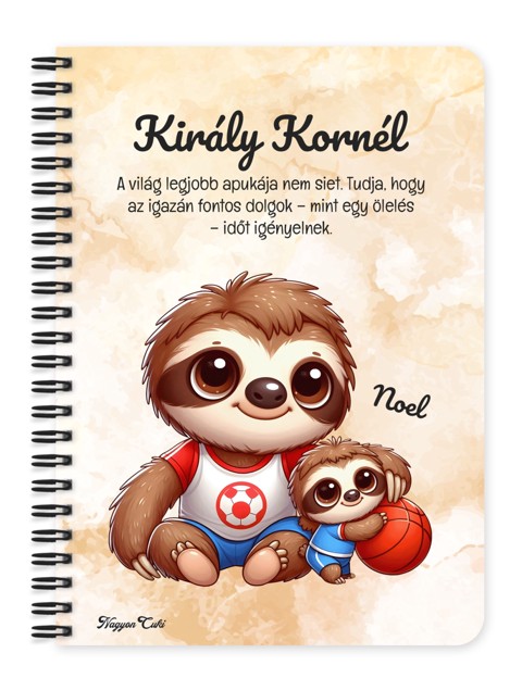 Névvel & Idézettel Kérhető Kosaras Cuki lajhár Apa és a gyerek mintás Füzet | Névre Szóló Ajándék Apáknak & Személyes Jegyzetfüzet | nagyoncuki.hu Képzeld el Apát egy nehéz munkanapon, vagy amikor épp a család jövőjét tervezi. Kiveszi a táskájából ezt a füzetet, és mielőtt kinyitná, megpillantja a borítót: a nagy, erős lajhárt (Önmagát), akin ott lógnak a kis lajhárok (a Ti gyermekeitek), és alatta az az idézet, amit Ti választottatok neki. Abban a pillanatban a munka nem csak munka többé. Hanem cél. Mert eszébe jut, hogy kikért csinálja mindezt! Ezt a mindennapi erőt és motivációt zártuk ebbe a Cuki Lajhár Apa füzetbe. Ez a füzet a "Biztonságos Fa" szimbóluma. Azt üzeni, hogy bárhogy is pörög a világ, Apa nyugalma és szeretete az, ami összetartja a családot! A grafikán a büszke apa lajhár látható az ölelő kicsikkel. A személyre szabható idézet (pl. "A világ legjobb Apukájának" vagy "Te vagy a mi hősünk") pedig megkoronázza az ajándékot. Ezt a terméket mi, a nagyoncuki.hu csapata terveztük, hogy Apa minden gondolata és terve a legjobb helyen legyen Miért válaszd ezt a személyre szabható lajhár apa mintás füzetet? Kettős Személyre Szabás: Nemcsak a neveket kérheted rá (Apa + Gyerekek), hanem egy egyedi idézetet vagy üzenetet is! Így válik ez a füzet egy személyes levéllé, amit mindig magánál hordhat. Motiváció a hétköznapokban: Legyen szó munkahelyi értekezletről vagy otthoni barkácstervekről, ez a füzet mindig emlékezteti a legfontosabbakra Praktikus és Minőségi: A füzet két méretben (A5 és A6) elérhető. A strapabíró spirálkötés és a 60 minőségi, vonalas lap (120 oldal) gondoskodik a kényelmes használatról. Extra Meglepetés: Minden füzethez egy ajándék post-it szett is jár, hogy a legfontosabb gondolatok mindig szem előtt lehessenek.Tökéletes Ajándék: Apák napjára, születésnapra, karácsonyra – vagy bármikor, amikor szeretnéd, hogy érezze a támogatásotokat. Termékjellemzők: Méretek: Választható A5 (kb. 13,5 cm x 21 cm) vagy A6 (kb. 10,5 cm x 14,5 cm) Borító: Személyre szabható névvel és/vagy egyedi idézettel, matt felülettel Belső: Kb. 60 csíkos lap (120 oldal), tetején "memo" és "Subject" segédlettel Kötés: Praktikus és tartós fekete fémspirál Extra: Ajándék post-it szett a füzet elején Egyedi felirattal is kérhető: Ne felejtsd el megadni a kért nevet és/vagy az egyedi idézetet. Vidd haza ezt a szeretet-hordozó füzetet, és adj Apának helyet a nagy tervekhez és a szép emlékekhez! Ha tetszik neked ez az igazán aranyos dizájn, és tetszenek a személyre szabható ajándék ötleteink, nézd meg a Cuki lajhárok kollekciónkat is a nagyoncuki.hu-n!