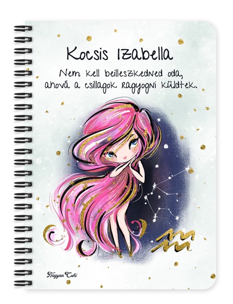 Személyre szabható - Rózsaszín hajú Csini Vízöntő lány mintás Zodiákus Füzet | Egyedi Horoszkópos Ajándék & Névre szóló Jegyzetfüzet | nagyoncuki.hu Képzeld el, ahogy elindul a napod: kezedben a kedvenc kávéd, előtted pedig egy füzet, ami pontosan olyan, mint Te! Ez a „csili-vili” Vízöntő lányos füzet nem csupán papír és spirál – ő egy vidám társ a mindennapokhoz, egy motivációs lökés a sűrű reggeleken, és egy igazán szívhez szóló, egyedi ajándék. A Vízöntő hölgyek a szabadság és az eredetiség nagykövetei. Ez a füzet ezt a vibráló energiát hozza el az asztalodra. Legyen szó napi teendőkről, nagy álmok tervezéséről vagy kreatív ötletelésről, ez a személyre szabott karakter garantáltan mosolyt csal az arcodra. Ezt a bájos dizájnt mi magunk, a nagyoncuki.hu csapata terveztük, nagy szeretettel, így biztos lehetsz benne, hogy egy igazán különleges, magyar dizájnnal készült darabbal leped meg szeretteidet vagy magadat! :)