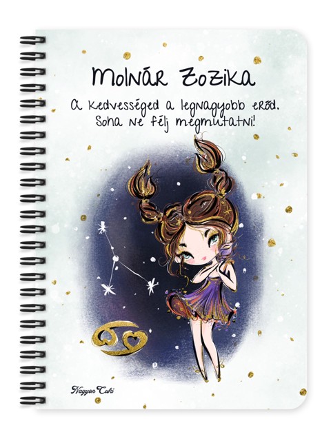 Személyre szabható - Barna hajú Csini Rák lány mintás Zodiákus Füzet | Egyedi Horoszkópos Ajándék & Névre szóló Jegyzetfüzet | nagyoncuki.hu Tudod, mi teszi igazán különlegessé a Rák hölgyeket? Az a végtelen empátia, a mély érzésvilág és az a természetes gondoskodás, amivel a szeretteiket körbeveszik. Ők a zodiákus „lélek nagykövetei”, akiknek a jegyzetei és emlékei ugyanolyan értékesek, mint a szívük melege. Ez a „csili-vili” Rák lányos füzet ezt a lágy, stílusos energiát hozza el az asztalodra. Ez a füzet nem csupán papír és spirál – ő egy puha ölelés a léleknek a mindennapok sűrűjében. Legyen szó a család koordinálásáról, személyes naplóról vagy kreatív ötletekről, a borítón visszaköszönő saját karaktered és neved mindig emlékeztetni fog rá, milyen különleges vagy! Ezt a bájos dizájnt mi magunk, a nagyoncuki.hu csapata terveztük, nagy szeretettel, így biztos lehetsz benne, hogy egy igazán különleges, magyar dizájnnal készült darabbal leped meg szeretteidet vagy magadat! :)