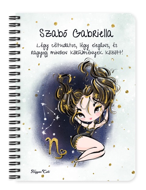 Személyre szabható - Barna hajú Csini Bak lány mintás Zodiákus Füzet | Egyedi Horoszkópos Ajándék & Névre szóló Jegyzetfüzet | nagyoncuki.hu Tudod, mi teszi igazán különlegessé a Bak hölgyeket? Az a rendíthetetlen kitartás, a belső tartás és az a természetes elegancia, amivel minden kihívást leküzdenek. Ők azok a céltudatos álmodozók, akik két lábbal állnak a földön, és pontosan tudják: a nagy célokhoz vezető út alapos tervezéssel kezdődik. Ez a „csili-vili” Bak lányos füzet a te stílusos társad lesz ezen az úton. Ez a füzet nem csupán papír és spirál – ő egy elegáns emlékeztető a céljaidra a mindennapok sűrűjében. Legyen szó üzleti megbeszélésről, heti teendőkről vagy jövőbeli terveidről, a borítón visszaköszönő saját karaktered és neved mindig azt üzeni: „Különleges vagy, és bármit elérhetsz.”! Ezt a bájos dizájnt mi magunk, a nagyoncuki.hu csapata terveztük, nagy szeretettel, így biztos lehetsz benne, hogy egy igazán különleges, magyar dizájnnal készült darabbal leped meg szeretteidet vagy magadat! :)