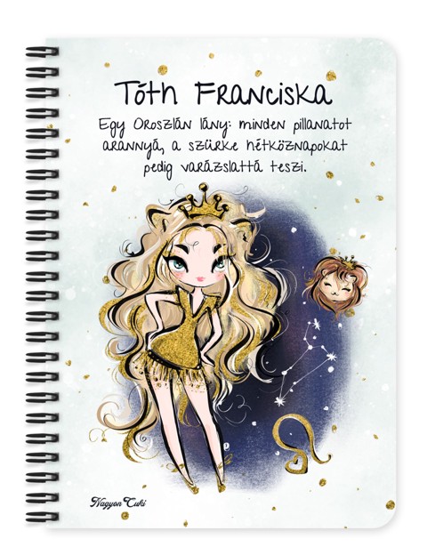 Személyre szabható - Szőke hajú Csini Oroszlán lány mintás Zodiákus Füzet | Egyedi Horoszkópos Ajándék & Névre szóló Jegyzetfüzet | nagyoncuki.hu Tudod, mi teszi igazán különlegessé a Oroszlán hölgyeket? Ahogy belépnek egy szobába, megtelik a tér fénnyel és melegséggel. Méltóságteljesek, nagylelkűek és elképesztő belső erővel rendelkeznek – ők a zodiákus természetes vezetői, akik imádják az életet és a szépséget. Ez a „csili-vili” Oroszlán lányos füzet ezt a fenséges energiát és stílust hozza el a mindennapjaidba. Ez a füzet nem csupán papír és spirál – ő egy ragyogó társ a nagy célok eléréséhez, egy motivációs lökés a reggeli kávé mellé, és egy igazán szívhez szóló, egyedi ajándék. Amikor a kezedbe veszed, és meglátod rajta a saját karakteredet és nevedet, tudni fogod: ma is te vagy a történeted főszereplője! Ezt a bájos dizájnt mi magunk, a nagyoncuki.hu csapata terveztük, nagy szeretettel, így biztos lehetsz benne, hogy egy igazán különleges, magyar dizájnnal készült darabbal leped meg szeretteidet vagy magadat! :)