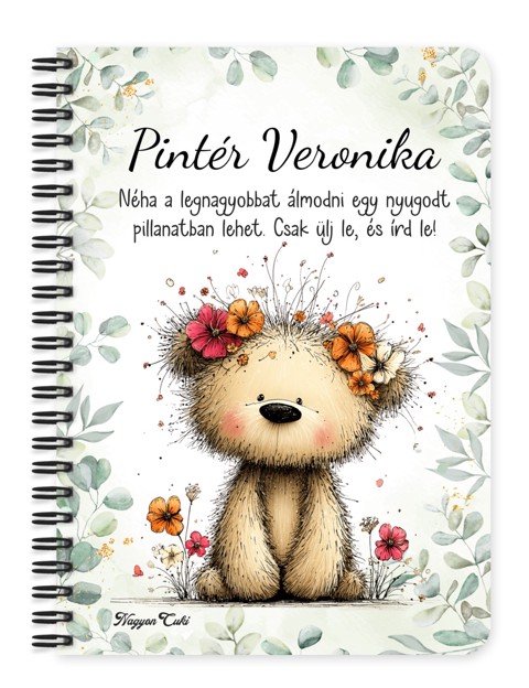 Névvel & Idézettel Kérhető - A legcukibb tavaszi macika mintás Füzet / Napló | Névre Szóló Ajándék & Személyes Jegyzetfüzet | nagyoncuki.hu Gondoltál már arra, milyen jó érzés tavasszal tiszta lappal indulni? Ahogy a természet leveti a téli szürkeséget, bennünk is felébred a vágy az új célok, a friss gondolatok és a kreatív tervek iránt. Ezt az inspiráló, ébredező energiát zártuk bele ebbe a személyre szabható Cuki Tavaszi erdei állatos füzetbe, az Erdei Varázs kollekciónk legújabb darabjába! Ez a füzet nem csupán üres lapok gyűjteménye. Ez egy biztonságos hely az új kezdeteknek. A borítón szimatoló, téli álmából ébredő borz arra emlékeztet: itt az idő megvalósítani azokat az álmokat, amiket eddig csak dédelgettél! Egy gyönyörű, személyes ajándék, ami a szeretet hordozójaként azt üzeni: "Hiszek a terveidben, vágj bele!" Ezt a bájos füzetet mi magunk, a nagyoncuki.hu csapata terveztük, így biztos lehetsz benne, hogy egy igazán egyedi, magyar és személyre szabható ajándék darabbal leped meg szeretteidet vagy magadat! Miért válaszd ezt a személyre szabható tavaszi maci mintás füzetet? Kettős Személyre Szabás: Tedd igazán egyedivé! A borítóra nemcsak a megajándékozott nevét kérheted, hanem egy saját, motiváló idézetet is. Így válik egy egyszerű tárgyból féltve őrzött emlék. Minőségi Társ a Mindennapokban: Legyen szó munkahelyi teendőkről, egyetemi jegyzetekről vagy hálanapló írásáról, ez a füzet bírni fogja a tempót Praktikus és Minőségi: A füzet két méretben (A5 és A6) elérhető. A strapabíró spirálkötés és a 60 minőségi, vonalas lap (120 oldal) gondoskodik a kényelmes használatról. Extra Meglepetés: Minden füzethez egy ajándék post-it szett is jár, hogy a legfontosabb gondolatok mindig szem előtt lehessenek. Tökéletes Tavaszi Ajándék: Keresve sem találhatnál szívhez szólóbb meglepetést Nőnapra, Húsvétra, Anyák napjára, vagy egy új iskola, munkahely kezdésekor! Kinek ideális ajándék ez az aranyos borz mintás füzet? A Nagy Tervezőknek és Álmodozóknak: Akik imádnak listákat írni, célokat kitűzni, és szeretik, ha mindez egy gyönyörű helyen van összegyűjtve. Személyes Ajándékot Keresőknek: Ha valami igazán egyedit, figyelmeset szeretnél adni, ami garantáltan örömkönnyeket csal a szemekbe. Termékjellemzők: Méretek: Választható A5 (kb. 13,5 cm x 21 cm) vagy A6 (kb. 10,5 cm x 14,5 cm) Borító: Személyre szabható névvel és/vagy egyedi idézettel, matt felülettel Belső: Kb. 60 csíkos lap (120 oldal), tetején "memo" és "Subject" segédlettel Kötés: Praktikus és tartós fekete fémspirál Extra: Ajándék post-it szett a füzet elején Egyedi felirattal is kérhető: Ne felejtsd el megadni a kért nevet és/vagy az egyedi idézetet a megjegyzés rovatban rendeléskor! Vidd haza a tavasz frissességét! Rendeld meg most ezt az egyedi, névre szóló Cuki Tavaszi maci mintás füzetet, és adj teret a legszebb gondolatoknak...mert mindenkinek jár egy kis cukiság. Ha tetszik neked ez az igazán aranyos dizájn, és tetszenek a személyre szabható ajándék ötleteink, nézd meg az Erdei varázs kollekciónkat is a nagyoncuki.hu-n!
