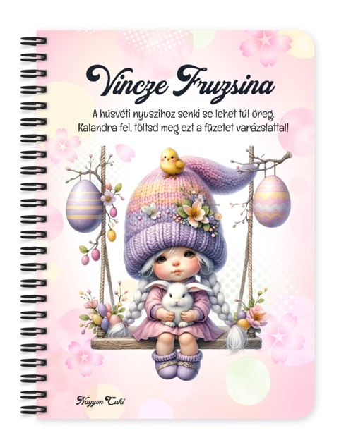 Névvel & Idézettel Kérhető - Hintázós Húsvéti manólány csibével mintás Füzet / Napló | Névre Szóló Ajándék & Személyes Jegyzetfüzet | nagyoncuki.hu Gondoltál már arra, mit is jelentenek valójában az ünnepi ajándékok? A tavasz és a húsvét a megújulás, az újjászületés és a családi együttlétek csodás időszaka. Amikor apróságokat rejtünk a nyuszifészekbe, azokkal valójában a szeretetünket fejezzük ki a másik iránt. Az ajándékok pusztán ezeknek az őszinte, mély érzéseknek a hordozói. Egy csokinyuszi édes, de hamar elfogy – ez a személyre szabható Aranyos Húsvéti Manó füzet viszont egy olyan maradandó üzenet, ami egész évben a megajándékozottal marad. Ezt a bájos füzetet mi magunk, a nagyoncuki.hu csapata terveztük, így biztos lehetsz benne, hogy egy igazán egyedi, magyar és személyre szabható ajándék darabbal leped meg szeretteidet vagy magadat! Miért válaszd ezt a személyre szabható húsvéti manós mintás füzetet? A Szeretet Hordozója: Nem csupán egy jegyzetfüzetet adsz, hanem egy személyes érzelmi üzenetet. A név és a saját idézet teszi ezt a tárgyat egy igazi, lelket melengető kincsé. Cukormentes, Maradandó Öröm: Tökéletes alternatívája vagy kiegészítője az édességeknek. Egy ajándék, ami nem fogy el az ünnepek után, hanem a mindennapok részévé válik. Elbűvölő Tavaszi Dizájn: A nyuszifüles, húsvéti manó azonnal megteremti az ünnepi hangulatot, és garantáltan mosolyt csal mindenki arcára Praktikus és Minőségi: A füzet két méretben (A5 és A6) elérhető. A strapabíró spirálkötés és a 60 minőségi, vonalas lap (120 oldal) gondoskodik a kényelmes használatról. Extra Meglepetés: Minden füzethez egy ajándék post-it szett is jár, hogy a legfontosabb gondolatok mindig szem előtt lehessenek. Tökéletes Ajándék Mindenkinek: Kislányoknak a nyuszifészekbe, édesanyáknak és nagymamáknak a receptekhez, vagy a locsolóknak egy kedves, egyedi meglepetésként. Termékjellemzők: Méretek: Választható A5 (kb. 13,5 cm x 21 cm) vagy A6 (kb. 10,5 cm x 14,5 cm) Borító: Személyre szabható névvel és/vagy egyedi idézettel, matt felülettel Belső: Kb. 60 csíkos lap (120 oldal), tetején "memo" és "Subject" segédlettel Kötés: Praktikus és tartós fekete fémspirál Extra: Ajándék post-it szett a füzet elején Egyedi felirattal is kérhető: Ne felejtsd el megadni a kért nevet és/vagy az egyedi idézetet a megjegyzés rovatban rendeléskor! Rejts egy igazán különleges, szívből jövő meglepetést az idei nyuszifészekbe! Rendeld meg most ezt az egyedi, névre szóló Cuki húsvéti manó mintás füzetet, és ajándékozz vele maradandó tavaszi mosolyt...mert mindenkinek jár egy kis cukiság.