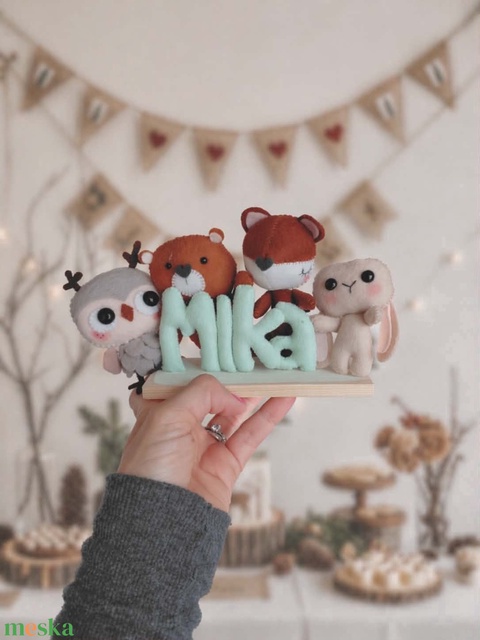 Erdei állatos névtábla fa talpon – egyedi gyerekszobai dekoráció