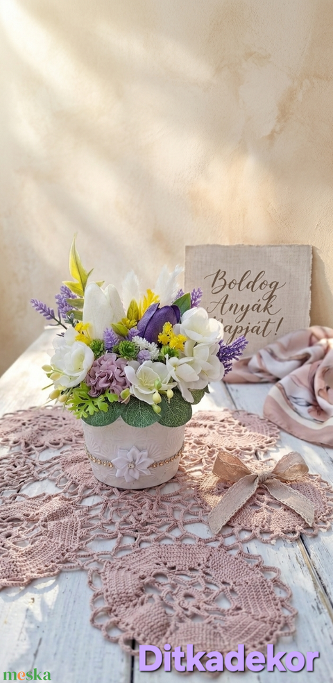 Elegáns Anyáknapi asztaldísz lila és fehér tulipánokkal(20cm magas)