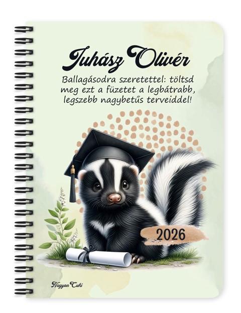 Minden oldal egy új lehetőség! Amikor az iskolapadot felváltja a nagybetűs élet, a legnagyobb tervek egy üres lapon kezdődnek. A névre szóló, borz mintás ballagási füzet egy szívből jövő útravaló. Inspiráló társ, ami nap mint nap emlékezteti a diákot a támogatásodra, miközben papírra veti a jövőjét, a legbátrabb álmait vagy az egyetemi jegyzeteit. Teljesen egyedi: A diák saját nevével, a 2026-os évszámmal és a Te saját üzeneteddel/idézeteddel készül. Nagybetűs tervekhez: Tökéletes naplónak, tervezőnek, vagy a legmerészebb álmok leírására általános, középiskolás vagy diplomás ballagóknak. Bármilyen ünnepre: Mivel az idézetet Te adod meg, tökéletesen illik ballagásra és diplomaosztóra is! Prémium minőség: Strapabíró spirálozás, gyönyörű borító és kiváló minőségű belső lapok. Tedd egyedivé a füzetet: 1. Füzet mérete: Válaszd ki a füzet méretét. 2. Név: Add meg, hogy mi legyen a név a füzeten (ha nem kérsz rá nevet, írd be: "nem kérek"). 3. Idézet / saját szöveg:
