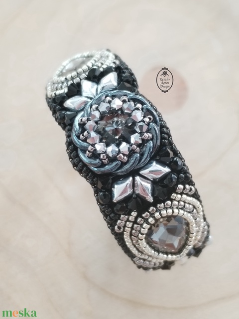 Fekete-ezüst gyöngyhímzett karkötő rivolival – elegáns, alkalmi statement ékszer
