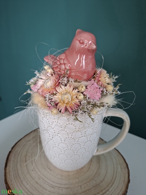Szárazvirágos bögrés dísz madárkával