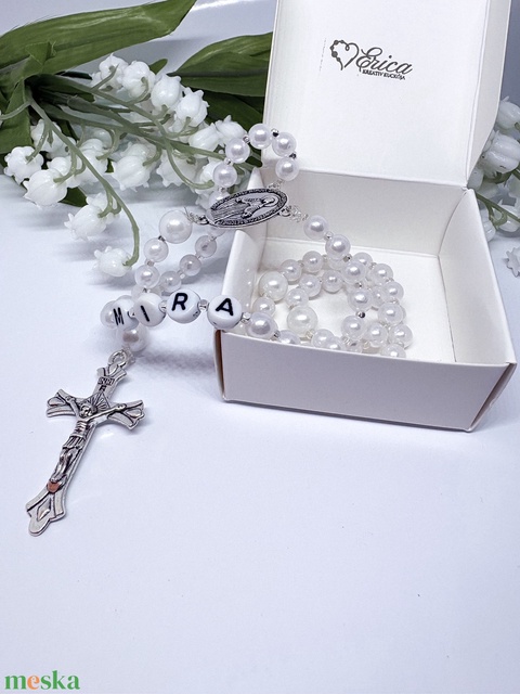 Névre szóló hófehér teklagyöngy rózsafüzér – Egyedi ajándék keresztelőre, elsőáldozásra