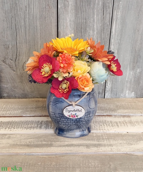 - Anyag/Összetevő kaspó, selyemvirágok, táblácska