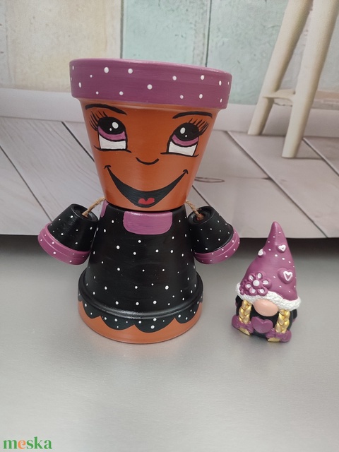 Pöttyös cserépbaba ajándék manóval
