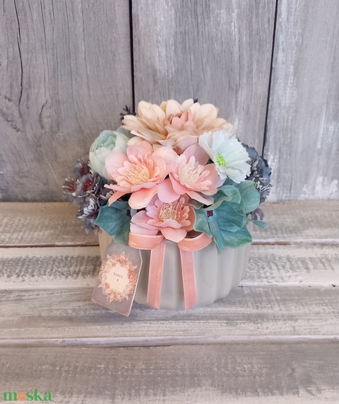 - Anyag/Összetevő kaspó, selyemvirágok, kártya, szalag