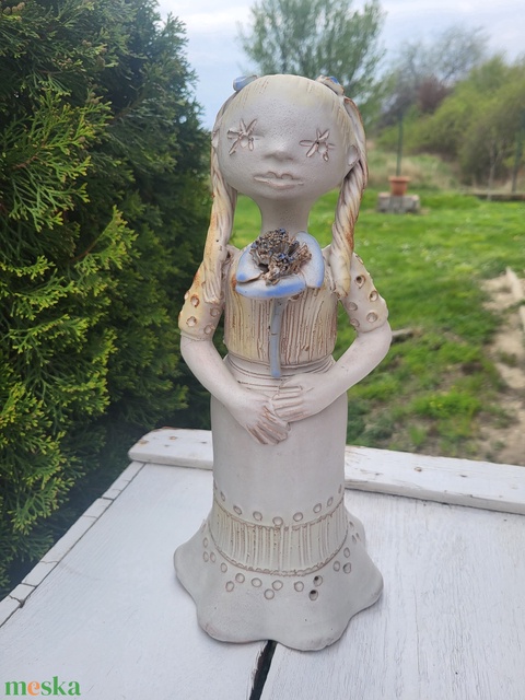Vintage Kovács Éva " Csillagszemű" mázas kerámia_Copfos lány virágcsokorral