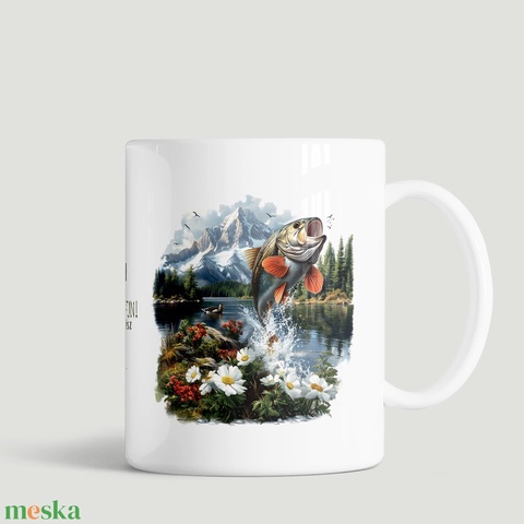 Horgász bögre hegyvidéki tájjal – „Fishing is fun!” feliratos ajándék Hobbi horgászoknak