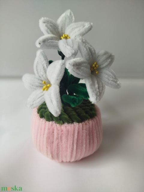 Fehér liliom rózsaszín kaspóban – kézzel készült örök virág