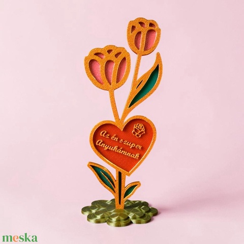 Emlékszel még azokra az anyák napi csokrokra, amelyek néhány nap után szomorúan elhervadtak a vázában? Az anyai gondoskodás és szeretet egy életre szól, miért adnál hát olyasmit, ami csak múló pillanat? Ez a gyönyörű, saját üzenettel ellátható páros tulipán asztali dísz megőrzi a legfontosabb szavakat, és megállítja az időt. Egy letisztult, elegáns meglepetés, amely az otthon legszebb éke lesz, és minden nap emlékezteti őt arra, mennyire fontos számodra.